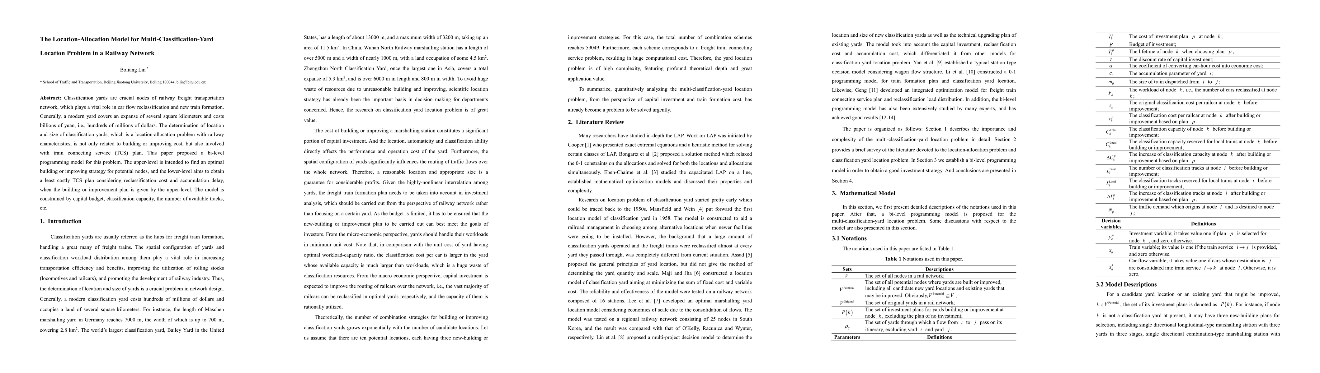 A new bi-level programming model is proposed to optimize the location and size of classification yards in railway networks, considering factors like building cost, train connecting service plan, and capital budget.