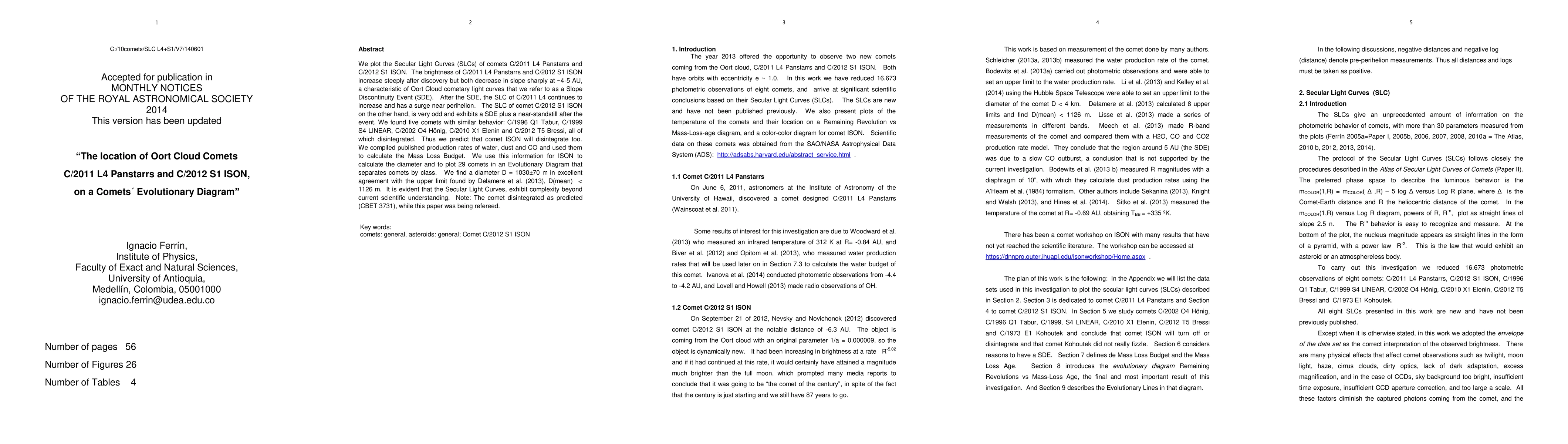 This paper analyzes the light curves of comets C/2011 L4 Panstarrs and C/2012 S1 ISON, identifying a Slope Discontinuity Event (SDE) indicative of Oort Cloud comets. It predicts ISON's disintegration based on similar behavior in other comets, and calculates ISON's diameter, finding it to be 1030±70 m, in agreement with previous estimates.