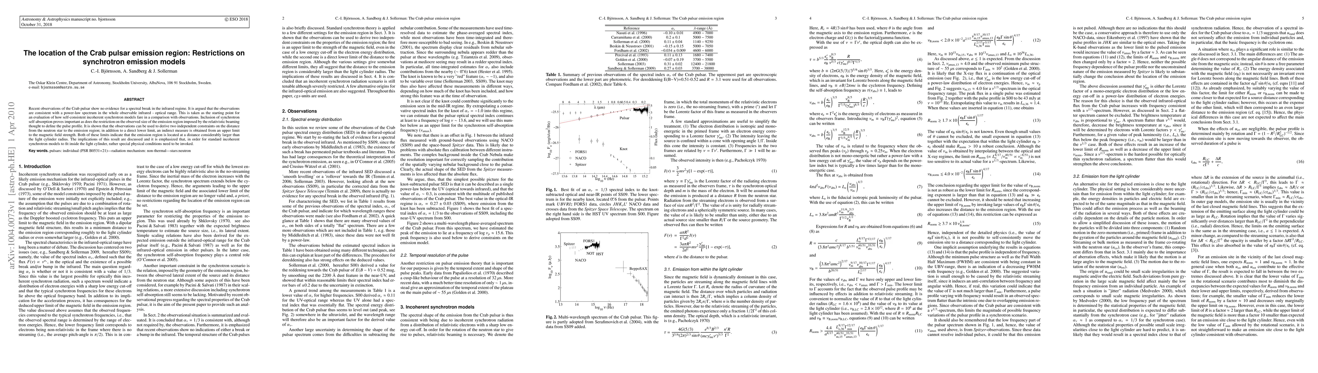 Recent observations of the Crab pulsar show no evidence for a spectral break in the infrared regime. It is argued that the observations are consistent with a power-law spectrum in the whole observable infrared - optical range. This is taken as the starting point for an evaluation of how self-consistent incoherent synchrotron models fare in a comparison with observations. Inclusion of synchrotron self-absorption proves important as does the restriction on the observed size of the emission region imposed by the relativistic beaming thought to define the pulse profile. It is shown that the observations can be used to derive two independent constraints on the distance from the neutron star to the emission region; in addition to a direct lower limit, an indirect measure is obtained from an upper limit to the magnetic field strength. Both of these limits indicate that the emission region is located at a distance considerably larger than the light cylinder radius. The implications of this result are discussed and it is emphasized that, in order for standard incoherent synchrotron models to fit inside the light cylinder, rather special physical conditions need to be invoked.
