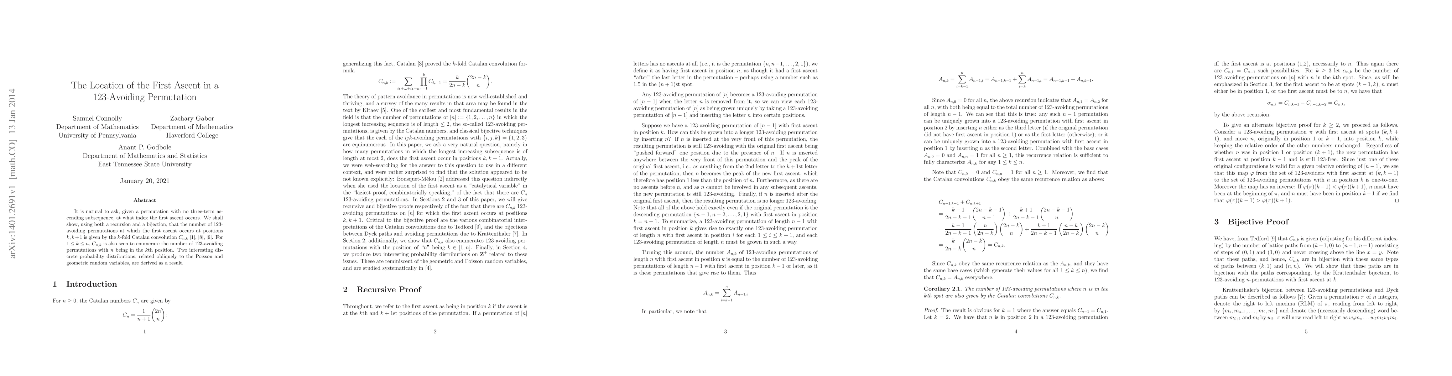 It is natural to ask, given a permutation with no three-term ascending subsequence, at what index the first ascent occurs. We shall show, using both a recursion and a bijection, that the number of 123-avoiding permutations at which the first ascent occurs at positions $k,k+1$ is given by the $k$-fold Catalan convolution $C_{n,k}$. For $1\le k\le n$, $C_{n,k}$ is also seen to enumerate the number of 123-avoiding permutations with $n$ being in the $k$th position. Two interesting discrete probability distributions, related obliquely to the Poisson and geometric random variables, are derived as a result.