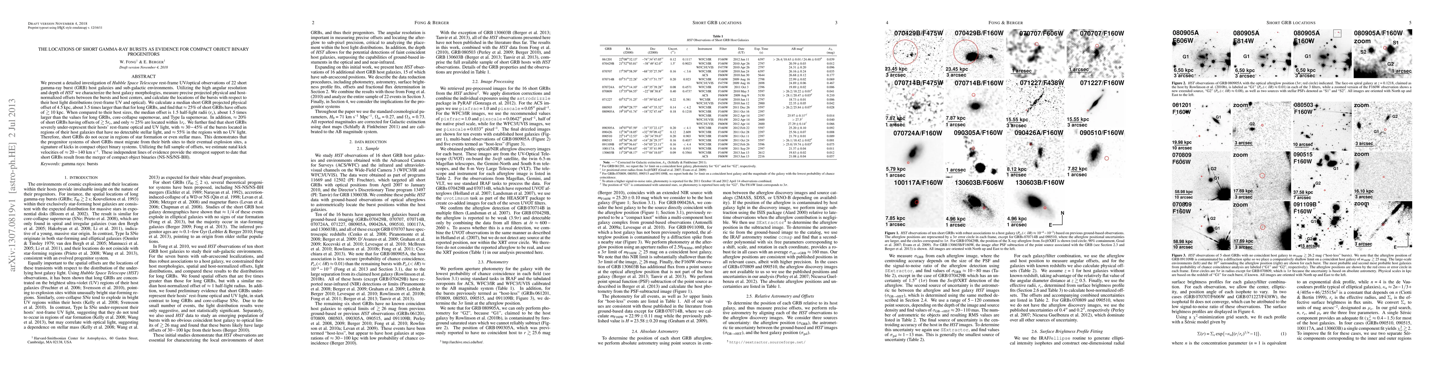 This study uses HST observations to analyze the locations of 22 short gamma-ray bursts (GRBs) relative to their host galaxies, finding median offsets of 4.5 kpc, significantly larger than long GRBs. The results suggest that short GRBs originate from compact object binary mergers, as they often occur in regions devoid of star formation.
