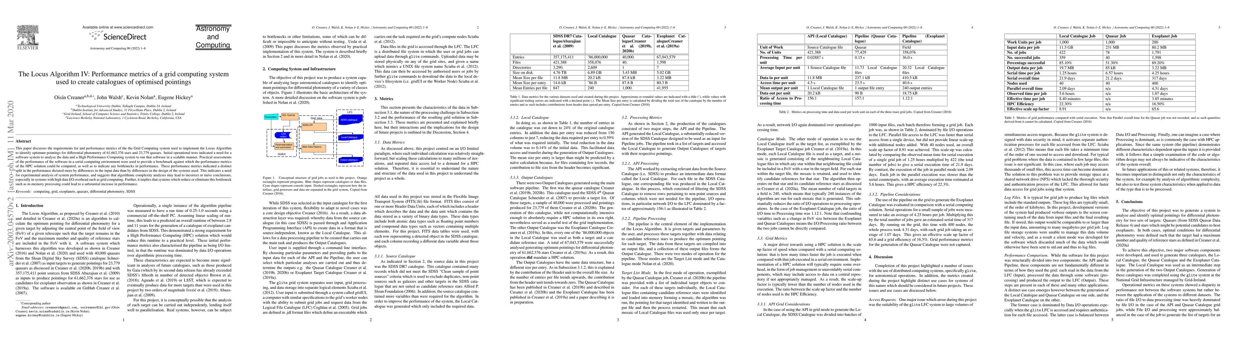 The Locus Algorithm IV paper analyzes performance metrics of a grid computing system used to create catalogues for 61 million stars and quasars, highlighting the need for experimental analysis and in-memory processing to improve performance.