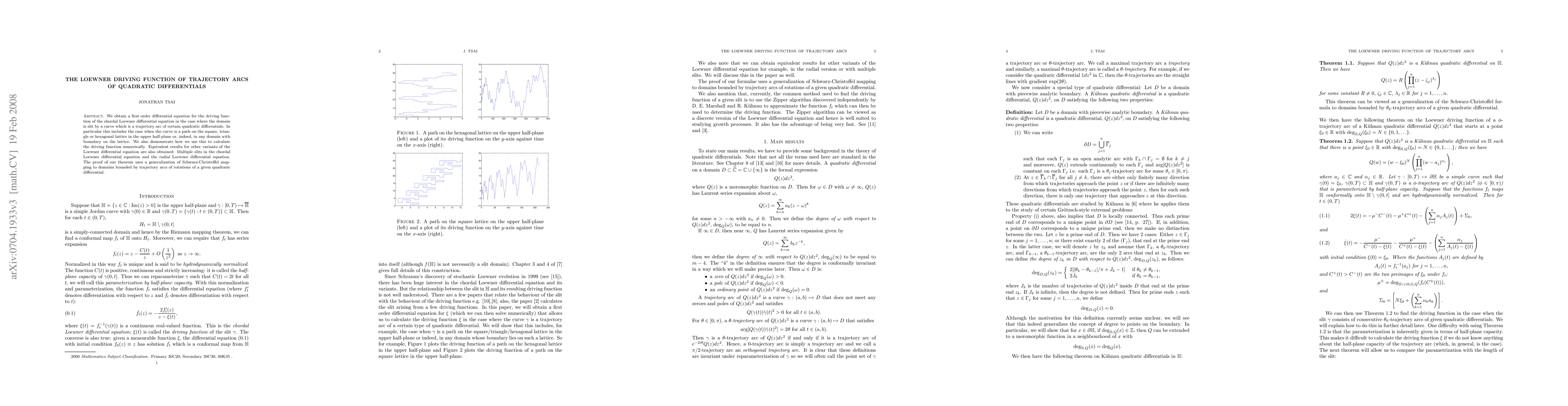 We obtain a first order differential equation for the driving function of the chordal Loewner differential equation in the case where the domain is slit by a curve which is a trajectory arc of certain quadratic differentials. In particular this includes the case when the curve is a path on the square, triangle or hexagonal lattice in the upper halfplane or, indeed, in any domain with boundary on the lattice. We also demonstrate how we use this to calculate the driving function numerically. Equivalent results for other variants of the Loewner differential equation are also obtained: Multiple slits in the chordal Loewner differential equation and the radial Loewner differential equation. The method also works for other versions of the Loewner differential equation. The proof of our formula uses a generalization of Schwarz-Christoffel mapping to domains bounded by trajectory arcs of rotations of a given quadratic differential that is of interest in its own right.