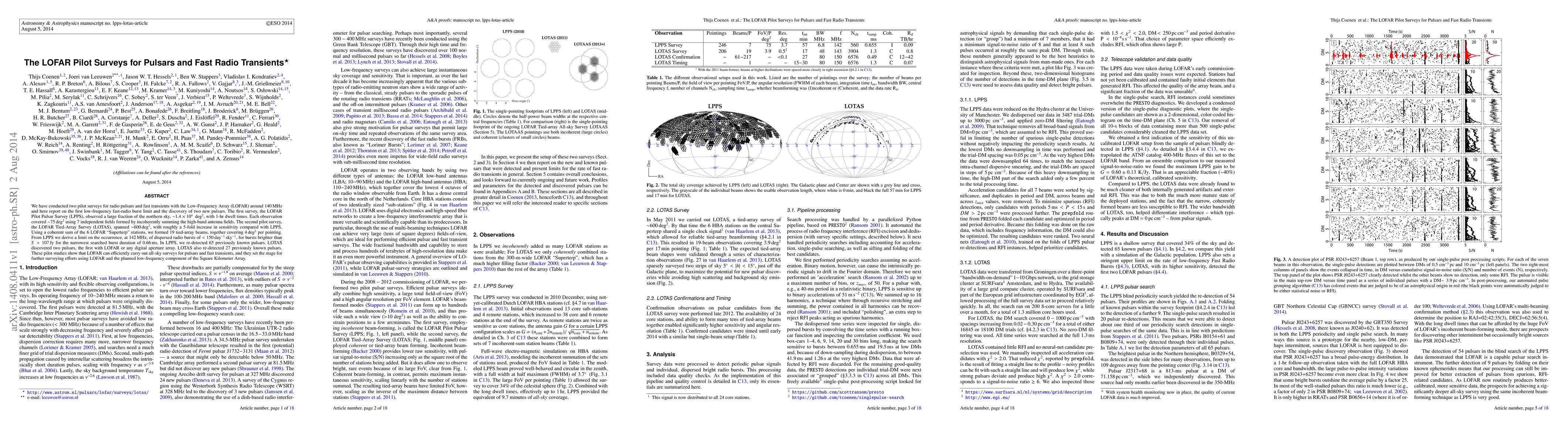The LOFAR Pilot Surveys for Pulsars and Fast Radio Transients utilized the Low-Frequency Array (LOFAR) to conduct two surveys, revealing the first low-frequency fast-radio burst limit and discovering two new pulsars. The surveys demonstrated LOFAR's capability for all-sky surveys of pulsars and fast transients.