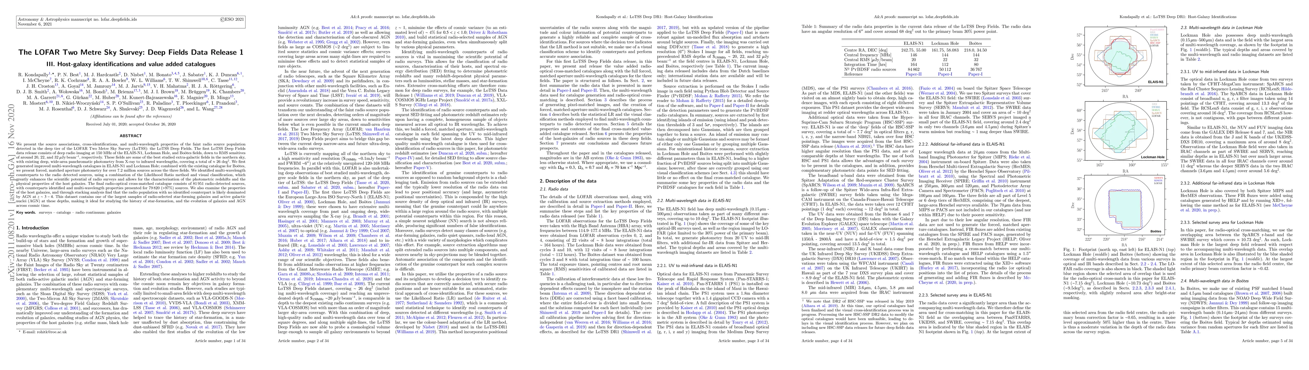 We present the source associations, cross-identifications, and multi-wavelength properties of the faint radio source population detected in the deep tier of the LOFAR Two Metre Sky Survey (LoTSS): the LoTSS Deep Fields. The first LoTSS Deep Fields data release consists of deep radio imaging at 150~MHz of the ELAIS-N1, Lockman Hole, and Bo\"{o}tes fields, down to RMS sensitives of around 20, 22, and 32$~\mu$Jy\,beam$^{-1}$, respectively. These fields are some of the best studied extra-galactic fields in the northern sky, with existing deep, wide-area panchromatic photometry from X-ray to infrared wavelengths, covering a total of $\approx$~26~\mbox{deg$^{2}$}. We first generated improved multi-wavelength catalogues in ELAIS-N1 and Lockman Hole; combined with the existing catalogue for Bo\"{o}tes, we present forced, matched aperture photometry for over 7.2 million sources across the three fields. We identified multi-wavelength counterparts to the radio detected sources, using a combination of the Likelihood Ratio method and visual classification, which greatly enhances the scientific potential of radio surveys and allows for the characterisation of the photometric redshifts and the physical properties of the host galaxies. The final radio-optical cross-matched catalogue consists of 81\,951 radio-detected sources, with counterparts identified and multi-wavelength properties presented for 79\,820 ($>$97\%) sources. We also examine the properties of the host galaxies, and through stacking analysis find that the radio population with no identified counterpart is likely dominated by AGN at $z\sim3-4$. This dataset contains one of the largest samples of radio-selected star-forming galaxies and active galactic nuclei (AGN) at these depths, making it ideal for studying the history of star-formation, and the evolution of galaxies and AGN across cosmic time.