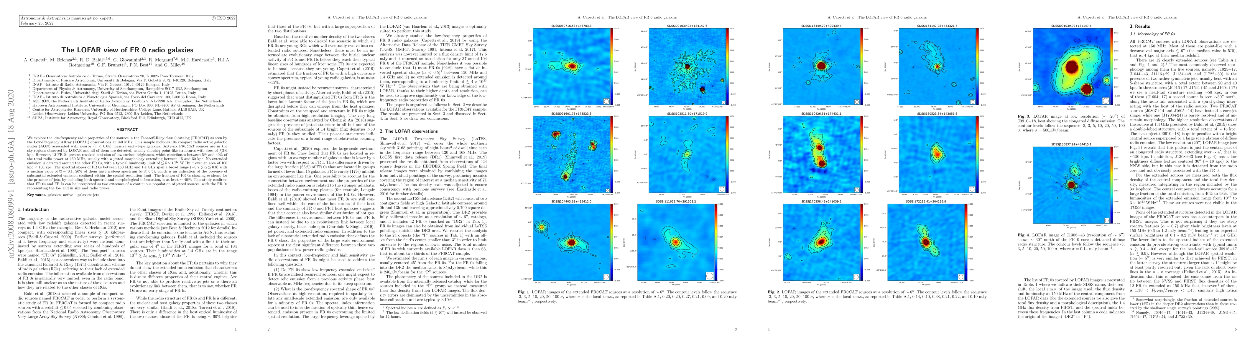 We explore the low-frequency radio properties of the sources in the Fanaroff-Riley class 0 catalog (FR0CAT) as seen by the LOw Frequency ARray (LOFAR) observations at 150 MHz. This sample includes 104 compact radio active galactic nuclei (AGN) associated with nearby (z<0.05) massive early-type galaxies. Sixty-six FR0CAT sources are in the sky regions observed by LOFAR and all of them are detected, usually showing point-like structures with sizes smaller than 3-6 kpc. However, 12 FR0s present resolved emission of low surface brightness which contributes between 5% and 40% of the total radio power at 150 MHz, usually with a jetted morphology extending between 15 and 50 kpc. No extended emission is detected around the other FR0s, with a typical luminosity limit of 5 x 10$^{22}$ W/Hz over an area of 100 kpc x 100 kpc. The spectral slopes of FR0s between 150 MHz and 1.4 GHz span a broad range (-0.7 < $\alpha$ < 0.8) with a median value of $\overline\alpha \sim 0.1$; 20% of them have a steep spectrum ($\alpha$ > 0.5), an indication of the presence of substantial extended emission confined within the spatial resolution limit. The fraction of FR0s showing evidence for the presence of jets, by including both spectral and morphological information, is at least ~40%. This study confirms that FR0s and FRIs can be interpreted as two extremes of a continuous population of jetted sources, with the FR0s representing the low end in size and radio power.