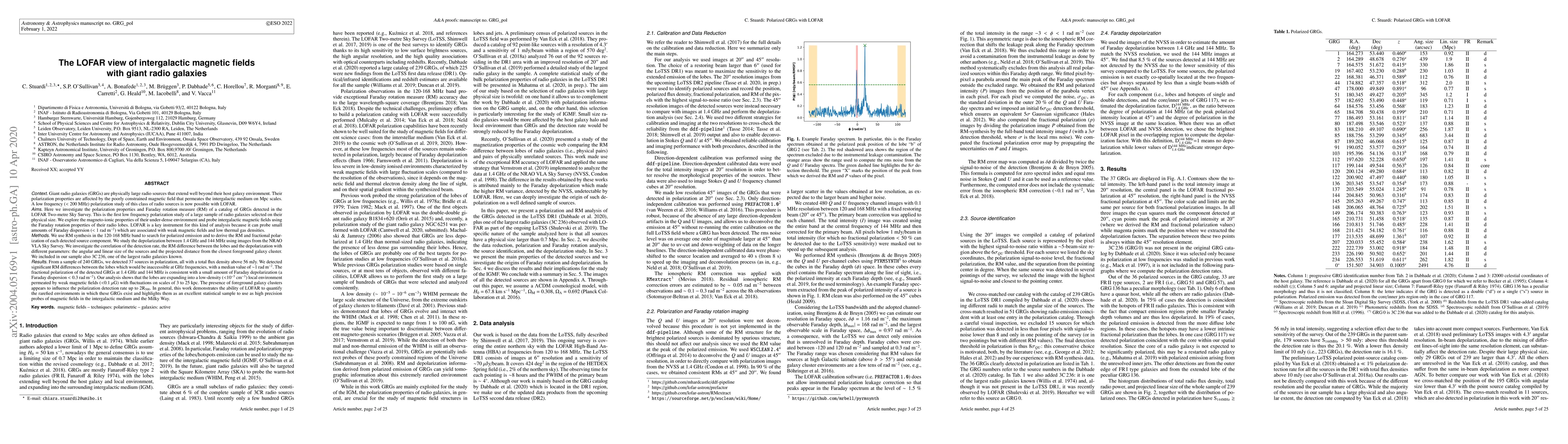 This study uses LOFAR to investigate the polarization properties of giant radio galaxies (GRGs), revealing weak intergalactic magnetic fields and low-density environments. The analysis detects polarization in 37 out of 240 GRGs, indicating small Faraday depolarization and weak magnetic fields less than 0.1 µG.