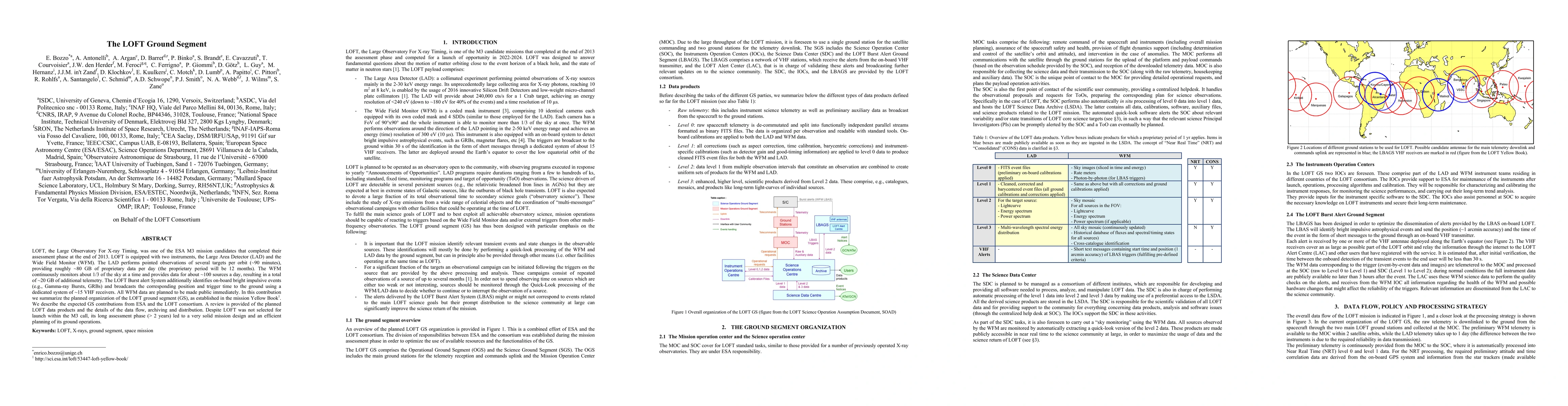 The LOFT ground segment, part of the ESA M3 mission candidates, involves the Large Area Detector and Wide Field Monitor for X-ray timing observations. The ground segment plans to manage and distribute the substantial data flow, including proprietary data from the LAD and public data from the WFM, while also handling burst alerts from the LOFT Burst Alert System.