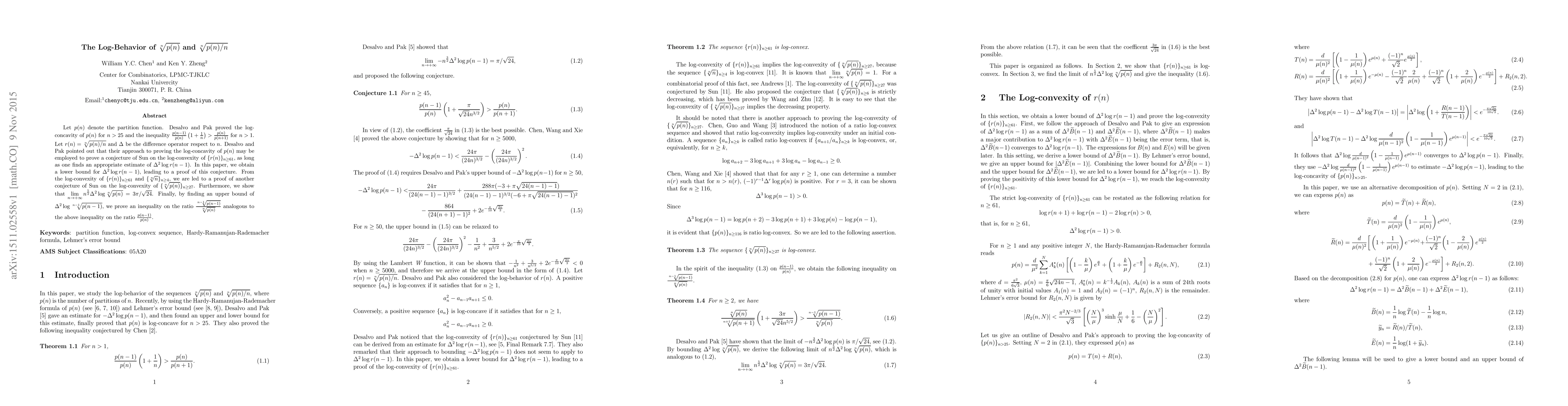 Let $p(n)$ denote the partition function. Desalvo and Pak proved the log-concavity of $p(n)$ for $n>25$ and the inequality $\frac{p(n-1)}{p(n)}\left(1+\frac{1}{n}\right)>\frac{p(n)}{p(n+1)}$ for $n>1$. Let $r(n)=\sqrt[n]{p(n)/n}$ and $\Delta$ be the difference operator respect to $n$. Desalvo and Pak pointed out that their approach to proving the log-concavity of $p(n)$ may be employed to prove a conjecture of Sun on the log-convexity of $\{r(n)\}_{n\geq 61}$, as long as one finds an appropriate estimate of $\Delta^2 \log r(n-1)$. In this paper, we obtain a lower bound for $\Delta^2\log r(n-1)$, leading to a proof of this conjecture. From the log-convexity of $\{r(n)\}_{n\geq61}$ and $\{\sqrt[n]{n}\}_{n\geq4}$, we are led to a proof of another conjecture of Sun on the log-convexity of $\{\sqrt[n]{p(n)}\}_{n\geq27}$. Furthermore, we show that $\lim\limits_{n \rightarrow +\infty}n^{\frac{5}{2}}\Delta^2\log\sqrt[n]{p(n)}=3\pi/\sqrt{24}$. Finally, by finding an upper bound of $\Delta^2 \log\sqrt[n-1]{p(n-1)}$, we prove an inequality on the ratio $\frac{\sqrt[n-1]{p(n-1)}}{\sqrt[n]{p(n)}}$ analogous to the above inequality on the ratio $\frac{p(n-1)}{p(n)}$.