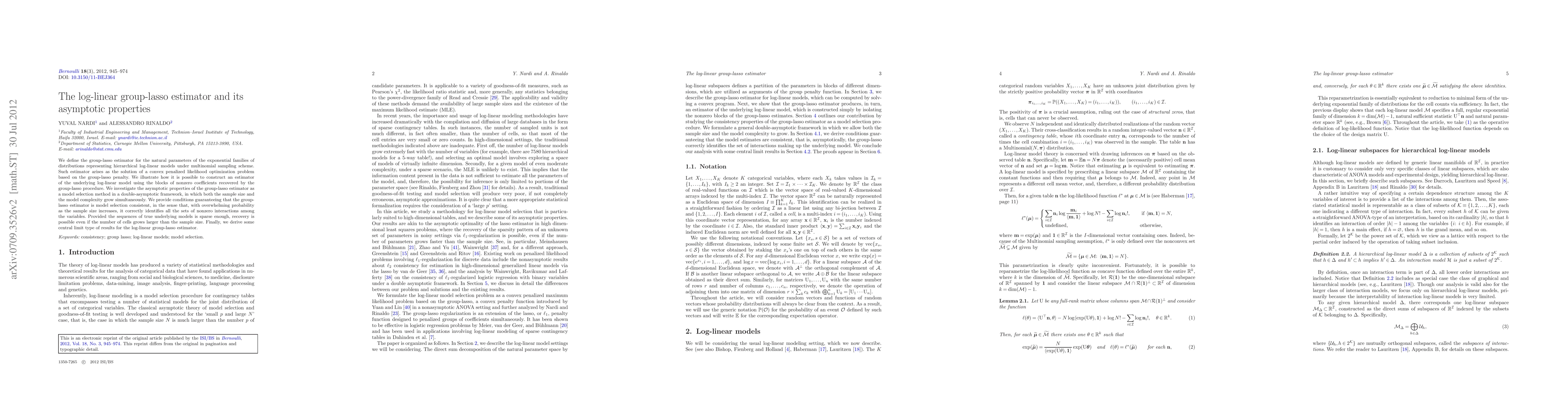 This paper introduces a group-lasso estimator for hierarchical log-linear models, demonstrating its asymptotic consistency in model selection and deriving central limit results for the estimator under a double-asymptotic framework where both sample size and model complexity increase. The method effectively identifies nonzero interactions even when the number of cells exceeds the sample size, provided the true model is sparse.