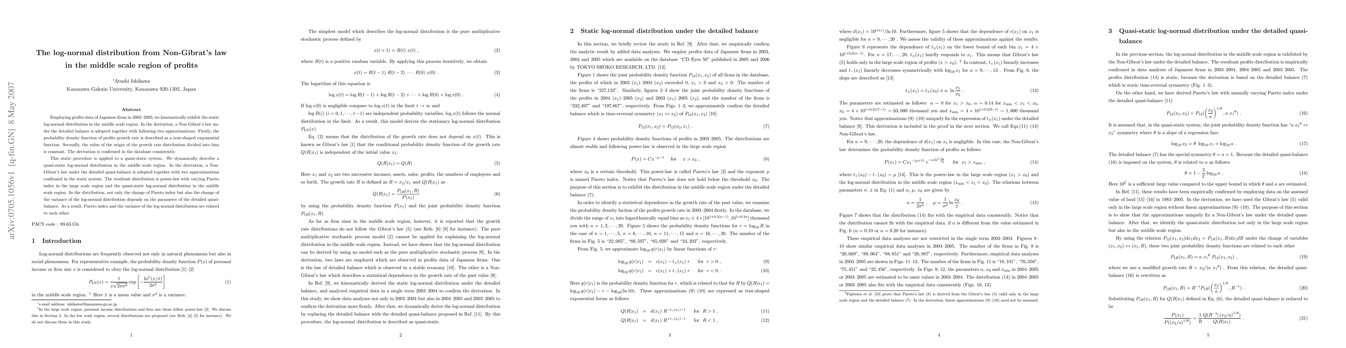 Employing profits data of Japanese firms in 2003--2005, we kinematically exhibit the static log-normal distribution in the middle scale region. In the derivation, a Non-Gibrat's law under the detailed balance is adopted together with following two approximations. Firstly, the probability density function of profits growth rate is described as a tent-shaped exponential function. Secondly, the value of the origin of the growth rate distribution divided into bins is constant. The derivation is confirmed in the database consistently. This static procedure is applied to a quasi-static system. We dynamically describe a quasi-static log-normal distribution in the middle scale region. In the derivation, a Non-Gibrat's law under the detailed quasi-balance is adopted together with two approximations confirmed in the static system. The resultant distribution is power-law with varying Pareto index in the large scale region and the quasi-static log-normal distribution in the middle scale region. In the distribution, not only the change of Pareto index but also the change of the variance of the log-normal distribution depends on the parameter of the detailed quasi-balance. As a result, Pareto index and the variance of the log-normal distribution are related to each other.
