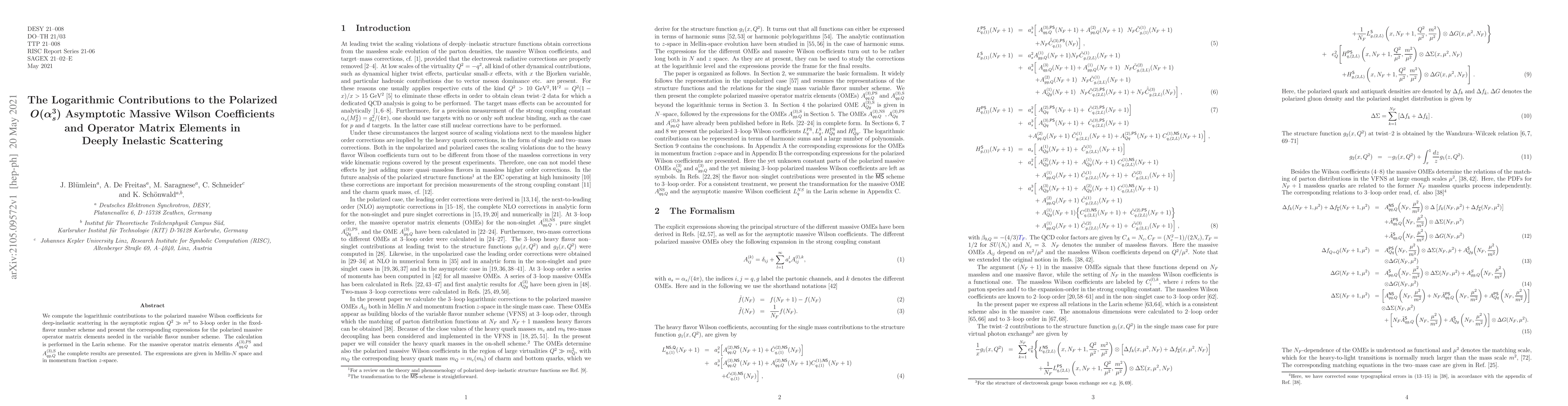 We compute the logarithmic contributions to the polarized massive Wilson coefficients for deep-inelastic scattering in the asymptotic region $Q^2 \gg m^2$ to 3-loop order in the fixed-flavor number scheme and present the corresponding expressions for the polarized massive operator matrix elements needed in the variable flavor number scheme. The calculation is performed in the Larin scheme. For the massive operator matrix elements $A_{qq,Q}^{(3),\rm PS}$ and $A_{qg,Q}^{(3),\rm S}$ the complete results are presented. The expressions are given in Mellin-$N$ space and in momentum fraction $z$-space.
