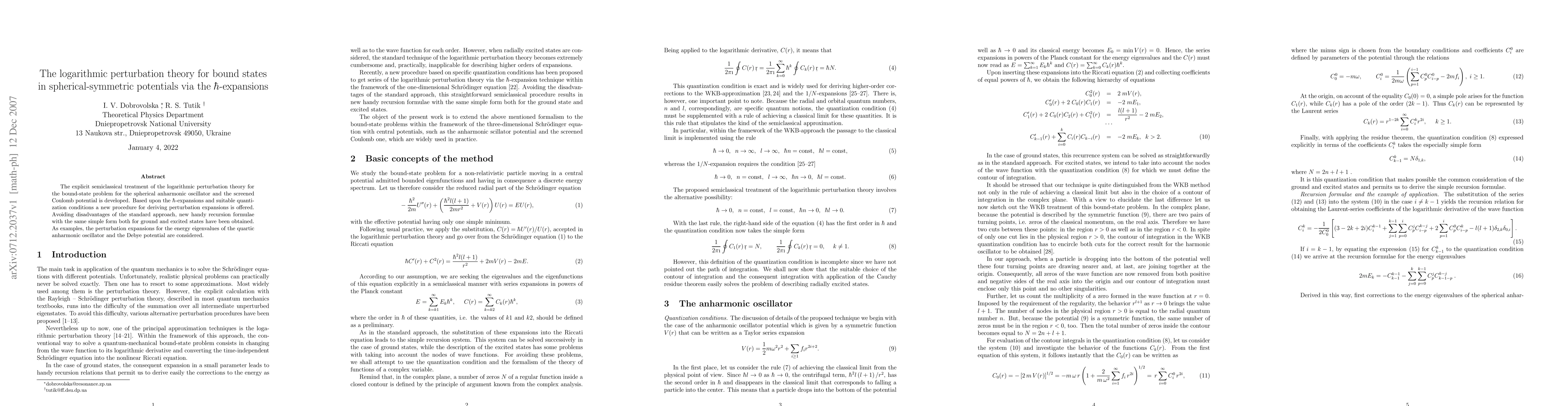 The paper develops a new semiclassical logarithmic perturbation theory for bound states in spherical-symmetric potentials using $\hbar$-expansions, providing a simplified recursion formula for both ground and excited states, and demonstrates its application to the quartic anharmonic oscillator and Debye potential.