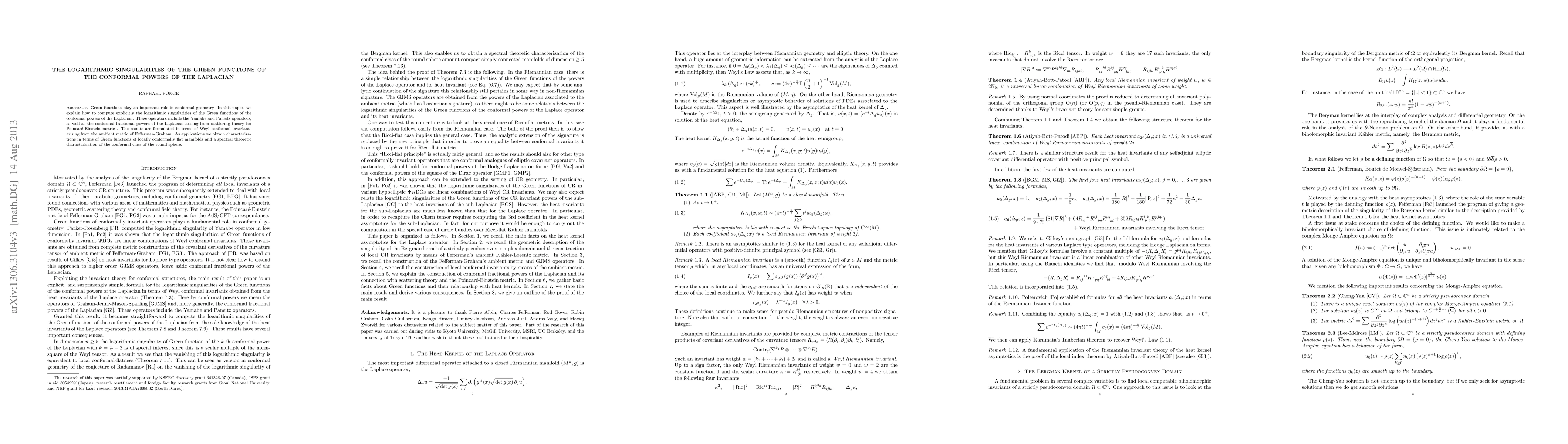 This paper computes the logarithmic singularities of Green functions for conformal powers of the Laplacian, including Yamabe and Paneitz operators, and applies these results to characterize locally conformally flat manifolds and the conformal class of the round sphere using Weyl conformal invariants.