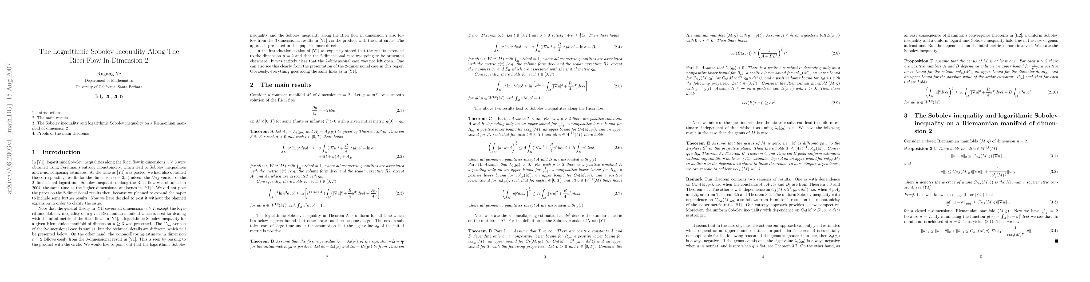 Summary: This paper investigates the logarithmic Sobolev inequality in the context of Ricci flow on two-dimensional manifolds. The findings provide insights into the behavior of entropy along the Ricci flow.
