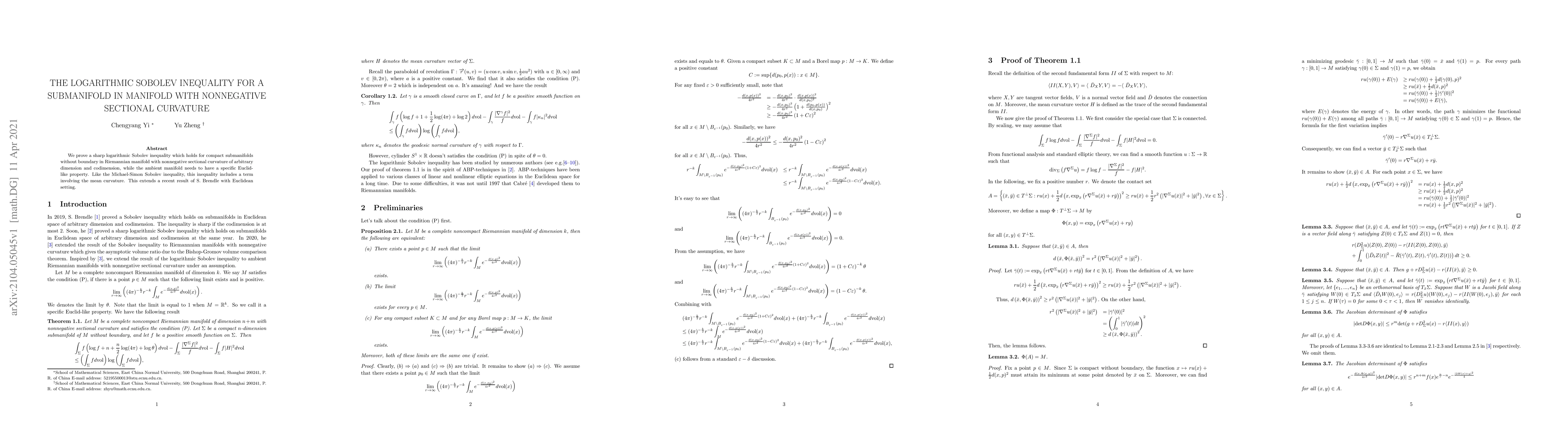 The paper establishes a sharp logarithmic Sobolev inequality for compact submanifolds in a Riemannian manifold with nonnegative sectional curvature, incorporating a term related to mean curvature. This extends Brendle's result to more general settings beyond Euclidean spaces.
