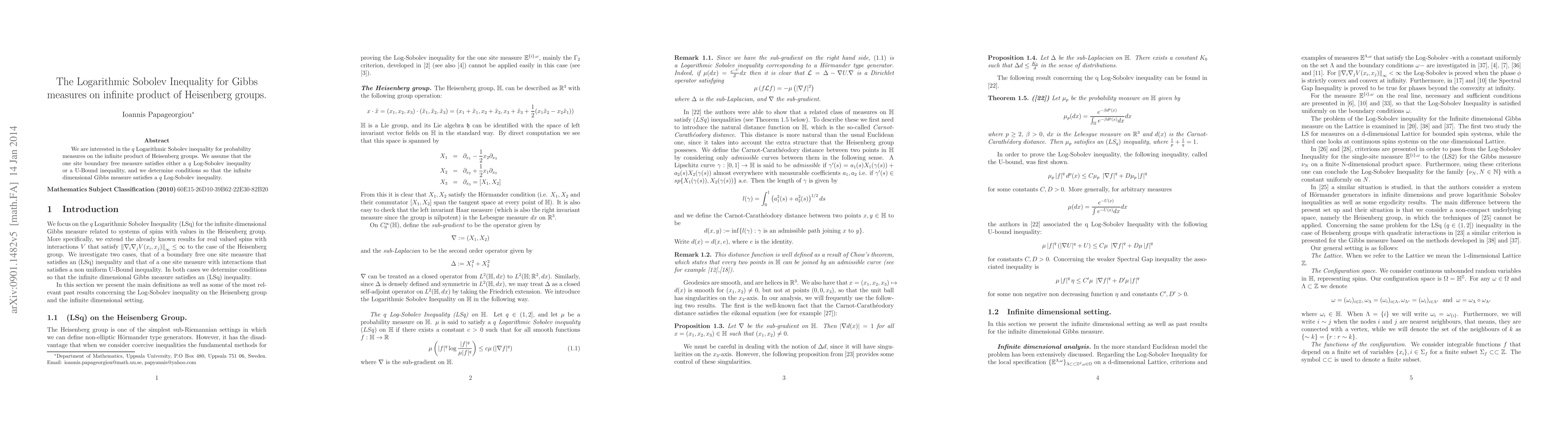 We are interested in the $q$ Logarithmic Sobolev inequality for probability measures on the infinite product of Heisenberg groups. We assume that the one site boundary free measure satisfies either a $q$ Log-Sobolev inequality or a U-Bound inequality, and we determine conditions so that the infinite dimensional Gibbs measure satisfies a $q$ Log-Sobolev inequality.