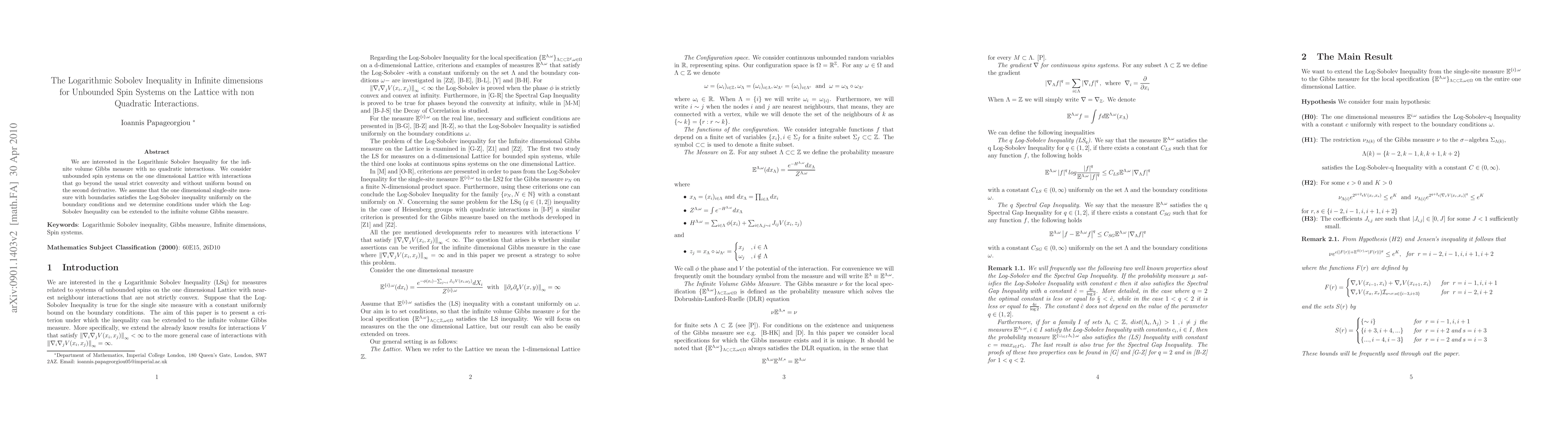 We are interested in the Logarithmic Sobolev Inequality for the infinite volume Gibbs measure with no quadratic interactions. We consider unbounded spin systems on the one dimensional Lattice with interactions that go beyond the usual strict convexity and without uniform bound on the second derivative. We assume that the one dimensional single-site measure with boundaries satisfies the Log-Sobolev inequality uniformly on the boundary conditions and we determine conditions under which the Log-Sobolev Inequality can be extended to the infinite volume Gibbs measure.