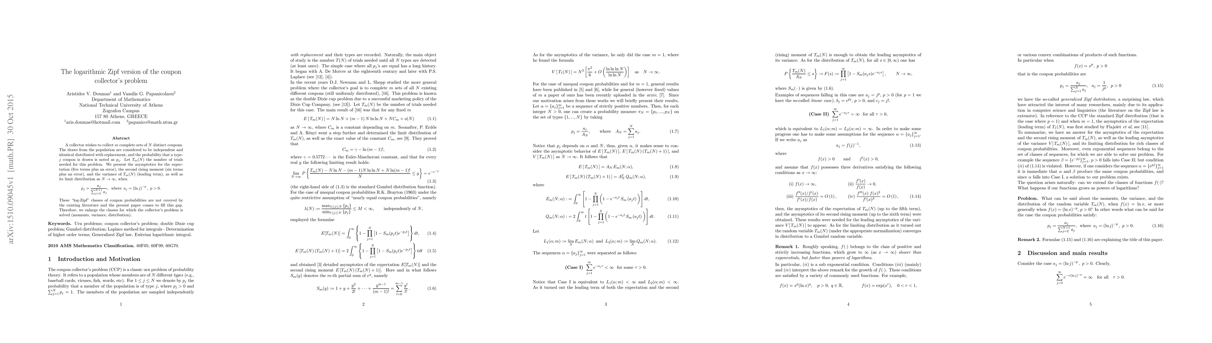 The paper presents an analytical approach to solve the coupon collector's problem with log-Zipf distributed probabilities, approximating sums by integrals and using Laplace's method for higher-order terms.