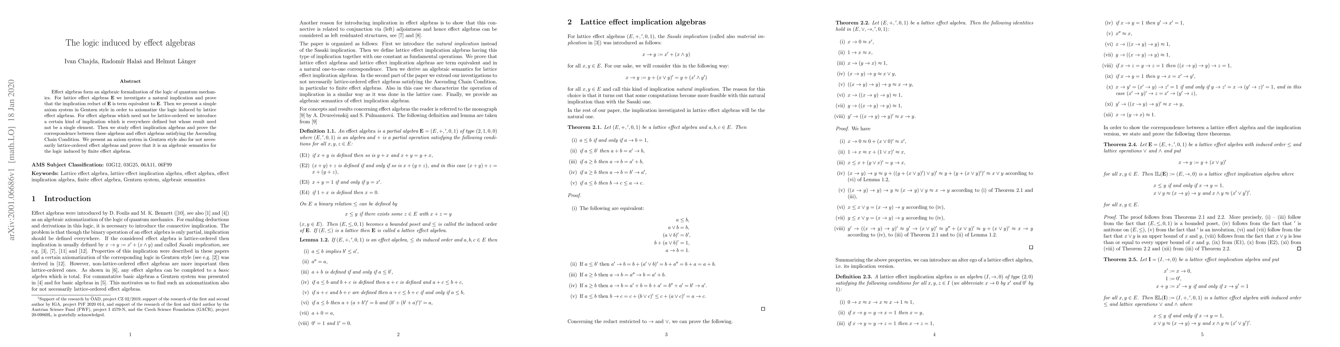 Effect algebras form an algebraic formalization of the logic of quantum mechanics. For lattice effect algebras E we investigate a natural implication and prove that the implication reduct of E is term equivalent to E. Then we present a simple axiom system in Gentzen style in order to axiomatize the logic induced by lattice effect algebras. For effect algebras which need not be lattice-ordered we introduce a certain kind of implication which is everywhere defined but whose result need not be a single element. Then we study effect implication algebras and prove the correspondence between these algebras and effect algebras satisfying the Ascending Chain Condition. We present an axiom system in Gentzen style also for not necessarily lattice-ordered effect algebras and prove that it is an algebraic semantics for the logic induced by finite effect algebras.
