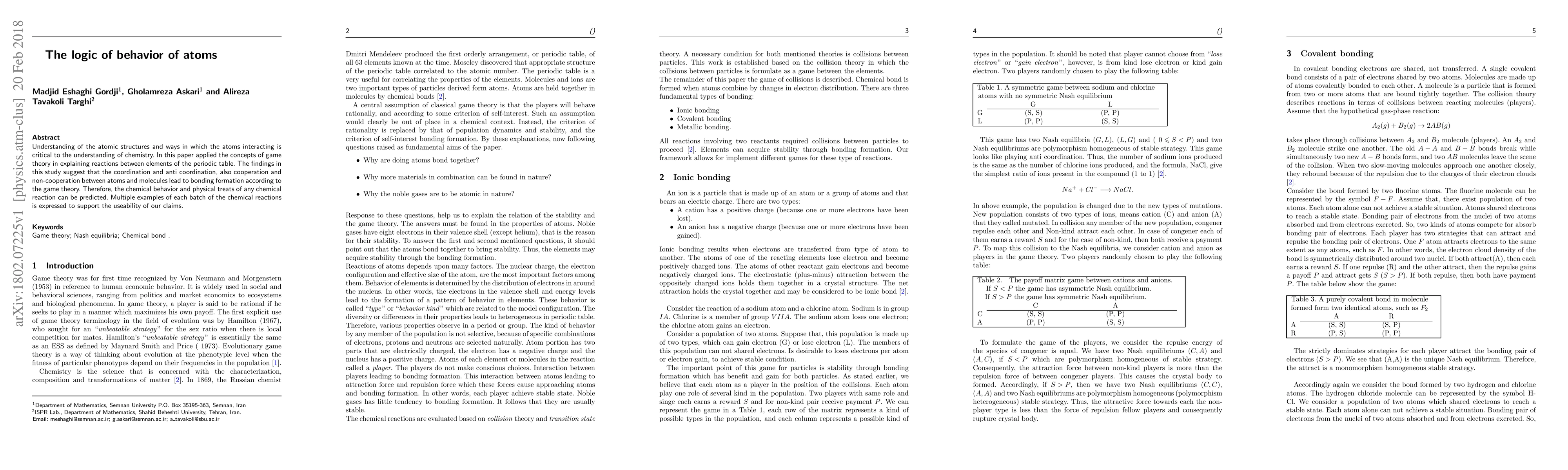 Understanding of the atomic structures and ways in which the atoms interacting is critical to the understanding of chemistry. In this paper applied the concepts of game theory in explaining reactions between elements of the periodic table. The findings in this study suggest that the coordination and anti coordination, also cooperation and non-cooperation between atoms and molecules lead to bonding formation according to the game theory. Therefore, the chemical behavior and physical treats of any chemical reaction can be predicted. Multiple examples of each batch of the chemical reactions is expressed to support the useability of our claims.