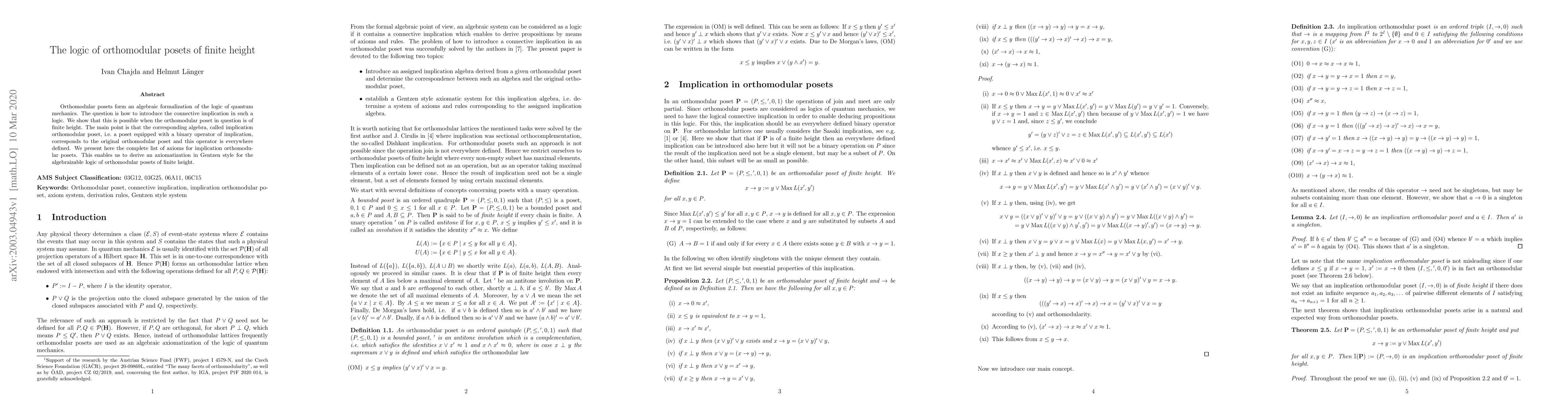 Orthomodular posets form an algebraic formalization of the logic of quantum mechanics. The question is how to introduce the connective implication in such a logic. We show that this is possible when the orthomodular poset in question is of finite height. The main point is that the corresponding algebra, called implication orthomodular poset, i.e. a poset equipped with a binary operator of implication, corresponds to the original orthomodular poset and this operator is everywhere defined. We present here the complete list of axioms for implication orthomodular posets. This enables us to derive an axiomatization in Gentzen style for the algebraizable logic of orthomodular posets of finite height.