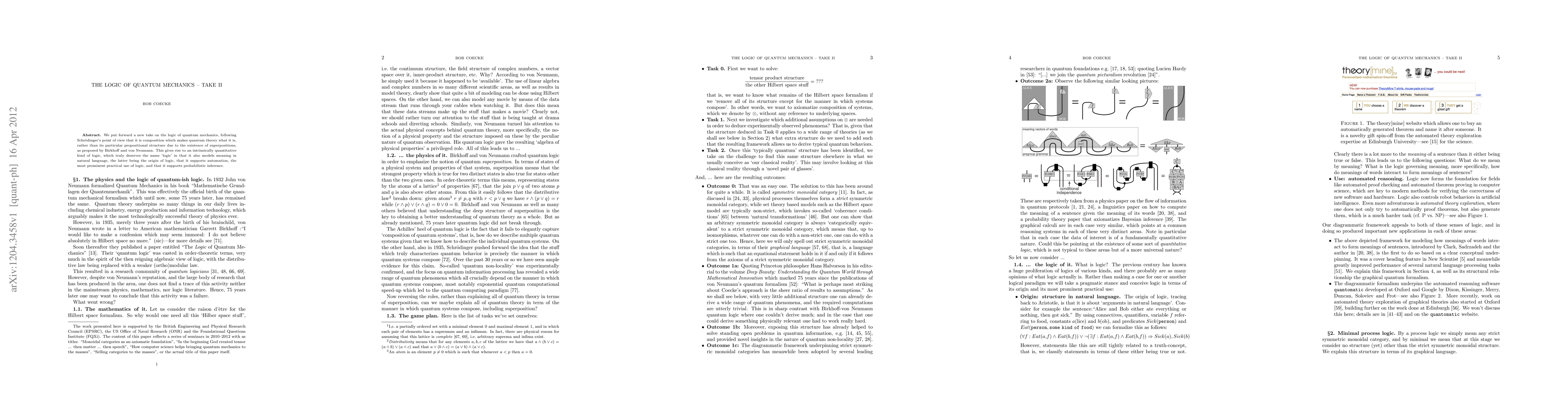 We put forward a new take on the logic of quantum mechanics, following Schroedinger's point of view that it is composition which makes quantum theory what it is, rather than its particular propositional structure due to the existence of superpositions, as proposed by Birkhoff and von Neumann. This gives rise to an intrinsically quantitative kind of logic, which truly deserves the name `logic' in that it also models meaning in natural language, the latter being the origin of logic, that it supports automation, the most prominent practical use of logic, and that it supports probabilistic inference.