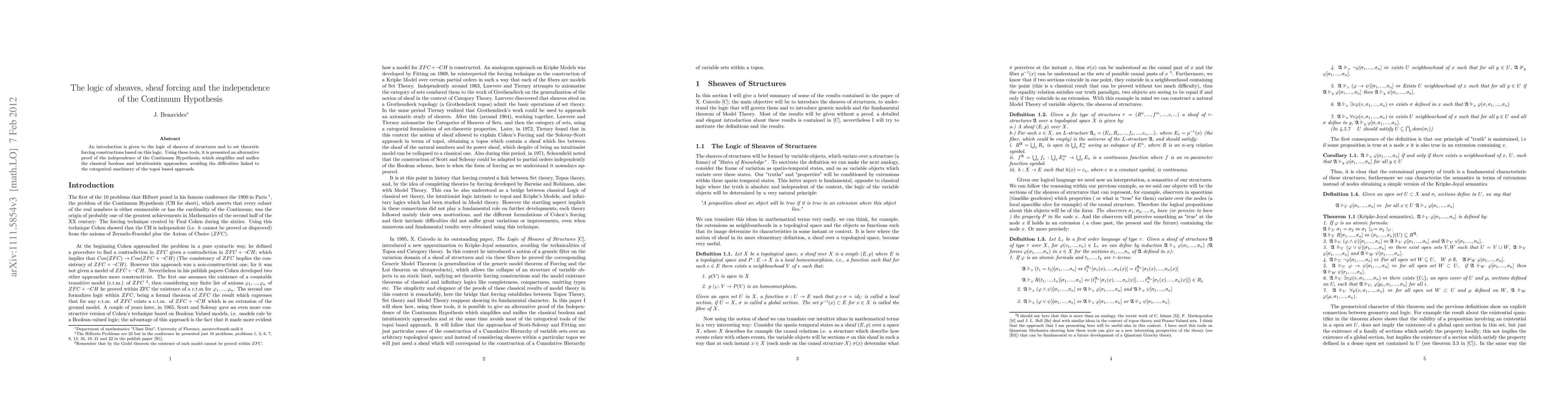 This paper presents an alternative proof of the independence of the Continuum Hypothesis using the logic of sheaves and set-theoretic forcing constructions, simplifying previous approaches.