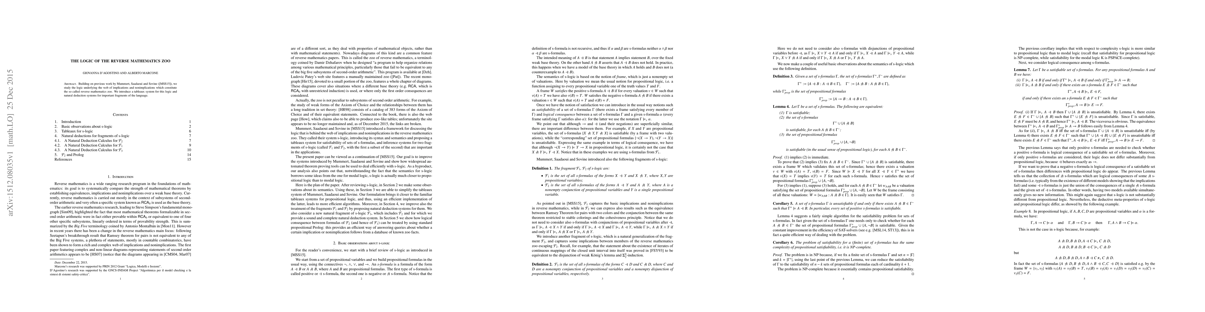 Building on previous work by Mummert, Saadaoui and Sovine, we study the logic underlying the web of implications and nonimplications which constitute the so called reverse mathematics zoo. We introduce a tableaux system for this logic and natural deduction systems for important fragments of the language.