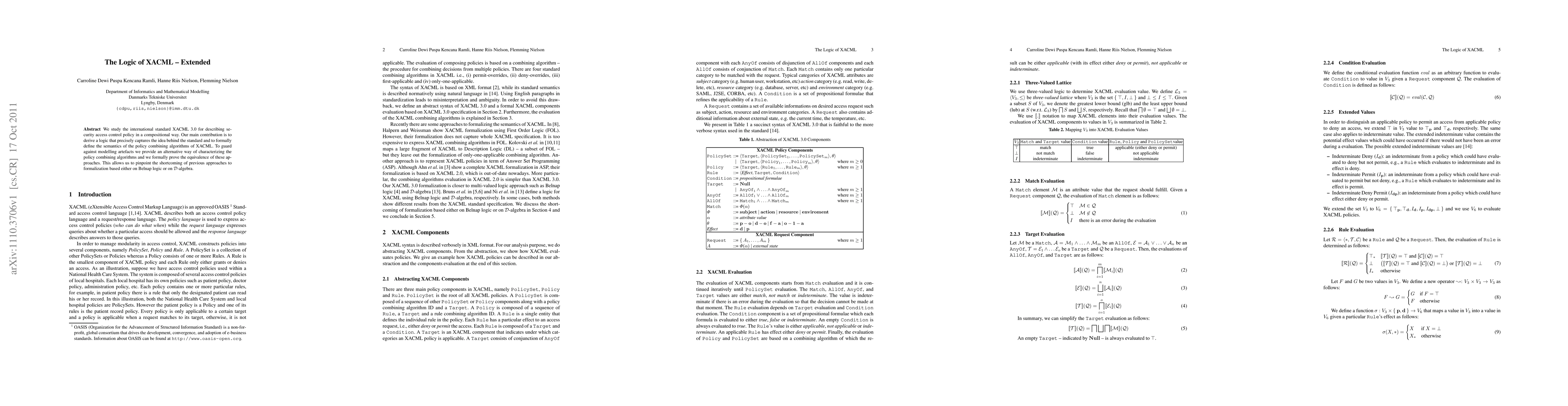 We study the international standard XACML 3.0 for describing security access control policy in a compositional way. Our main contribution is to derive a logic that precisely captures the idea behind the standard and to formally define the semantics of the policy combining algorithms of XACML. To guard against modelling artefacts we provide an alternative way of characterizing the policy combining algorithms and we formally prove the equivalence of these approaches. This allows us to pinpoint the shortcoming of previous approaches to formalization based either on Belnap logic or on D-algebra.