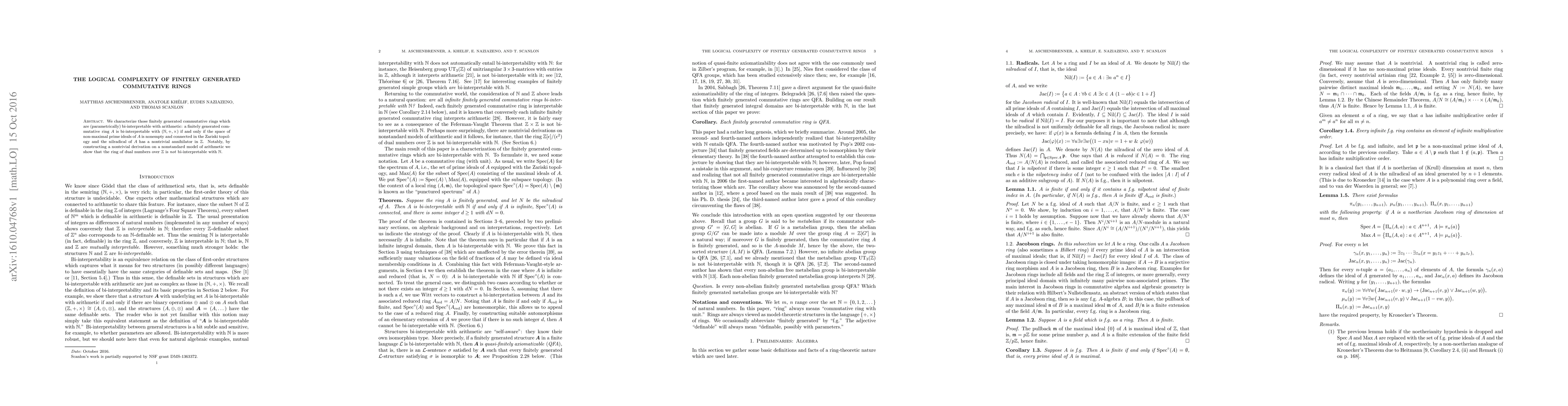 This paper characterizes finitely generated commutative rings that are bi-interpretable with arithmetic, identifying conditions such as nonempty, connected non-maximal prime ideals and nontrivial annihilators. It concludes by proving the ring of dual numbers over $\mathbb Z$ is not bi-interpretable with $\mathbb N$ using a nontrivial derivation.