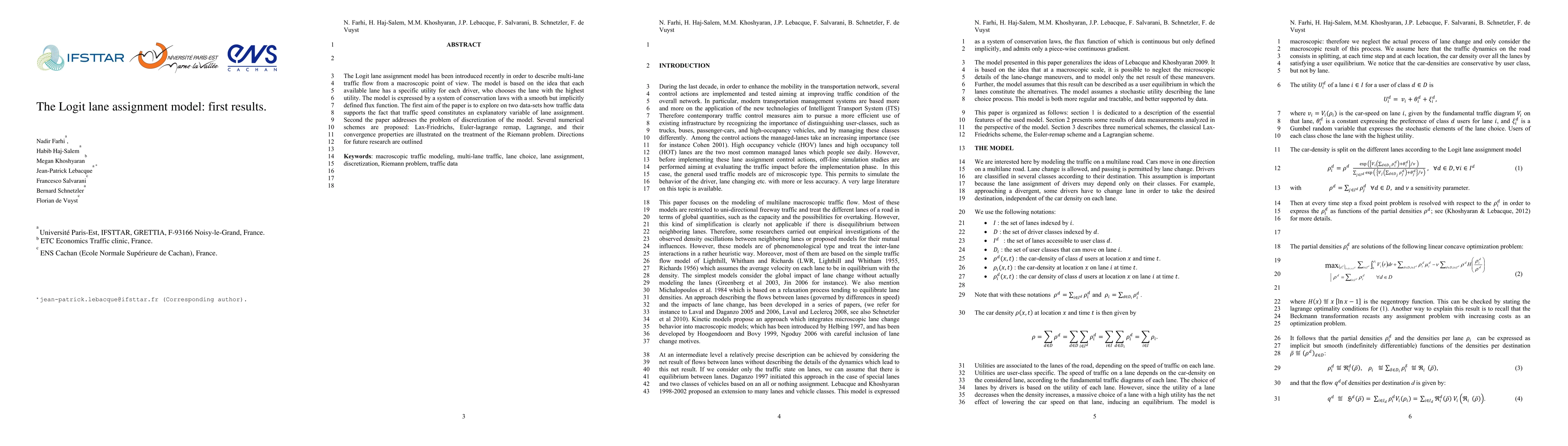 The Logit lane assignment model has been introduced recently in order to describe multi-lane traffic flow from a macroscopic point of view. The model is based on the idea that each available lane has a specific utility for each driver, who chooses the lane with the highest utility. The model is expressed by a system of conservation laws with a smooth but implicitly defined flux function. The first aim of the paper is to explore on two data-sets how traffic data supports the fact that traffic speed constitutes an explanatory variable of lane assignment. Second the paper addresses the problem of discretization of the model. Several numerical schemes are proposed: Lax-Friedrichs, Euler-lagrange remap, Lagrange, and their convergence properties are illustrated on the treatment of the Riemann problem. Directions for future research are outlined.