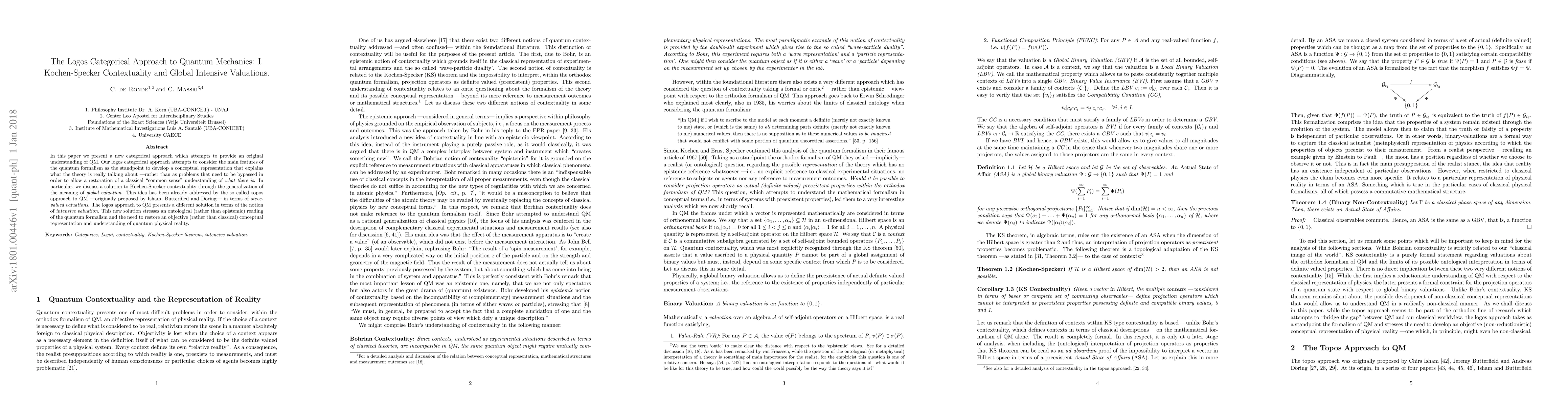 In this paper we present a new categorical approach which attempts to provide an original understanding of QM. Our logos categorical approach attempts to consider the main features of the quantum formalism as the standpoint to develop a conceptual representation that explains what the theory is really talking about --rather than as problems that need to be bypassed in order to allow a restoration of a classical "common sense" understanding of what there is. In particular, we discuss a solution to Kochen-Specker contextuality through the generalization of the meaning of global valuation. This idea has been already addressed by the so called topos approach to QM --originally proposed by Isham, Butterfield and D\"oring-- in terms of sieve-valued valuations. The logos approach to QM presents a different solution in terms of the notion of intensive valuation. This new solution stresses an ontological (rather than epistemic) reading of the quantum formalism and the need to restore an objective (rather than classical) conceptual representation and understanding of quantum physical reality.