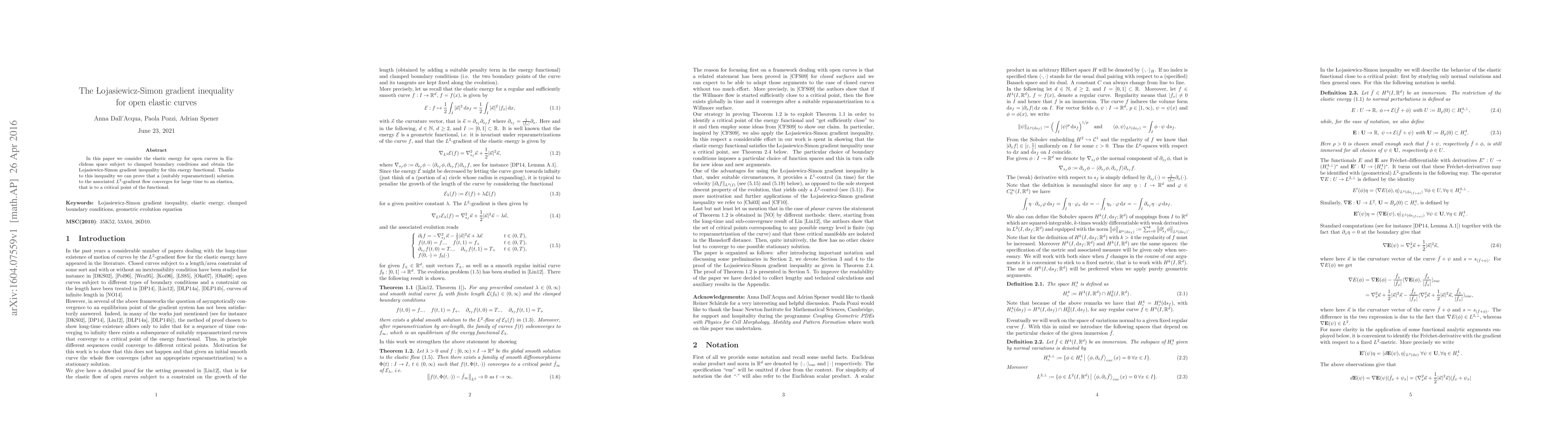 Researchers derived a gradient inequality for open elastic curves in Euclidean space, proving that solutions to associated flow equations converge to critical points over large time scales.