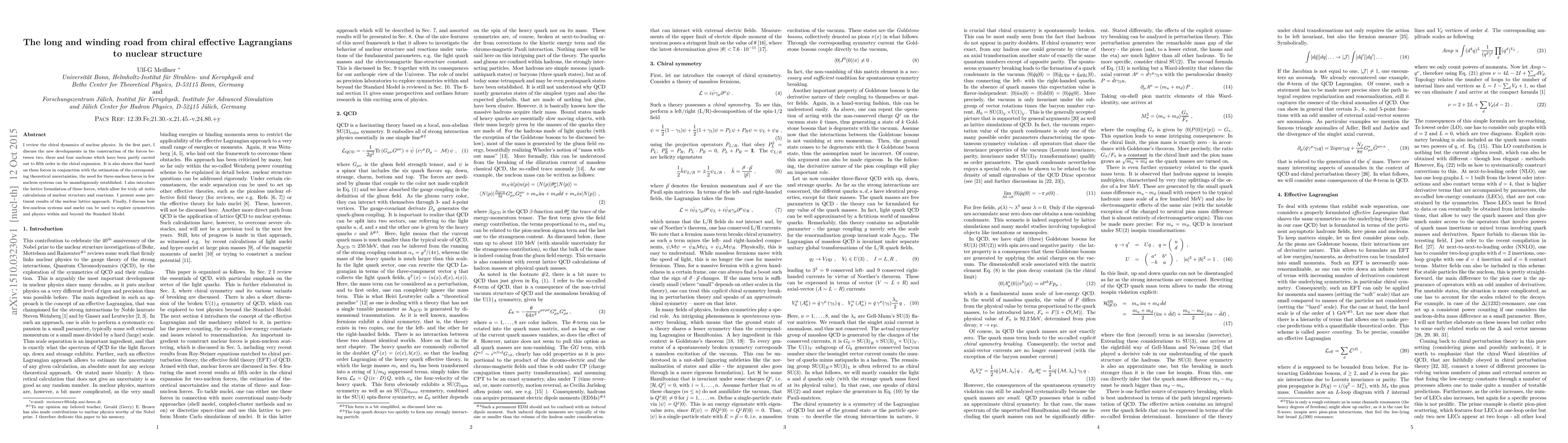 I review the chiral dynamics of nuclear physics. In the first part, I discuss the new developments in the construction of the forces between two, three and four nucleons which have been partly carried out to fifth order in the chiral expansion. It is also shown that based on these forces in conjunction with the estimation of the corresponding theoretical uncertainties, the need for three-nucleon forces in few nucleon systems can be unambiguously established. I also introduce the lattice formulation of these forces, which allow for truly ab initio calculations of nuclear structure and reactions. I present some pertinent results of the nuclear lattice approach. Finally, I discuss how few-nucleon systems and nuclei can be used to explore symmetries and physics within and beyond the Standard Model.