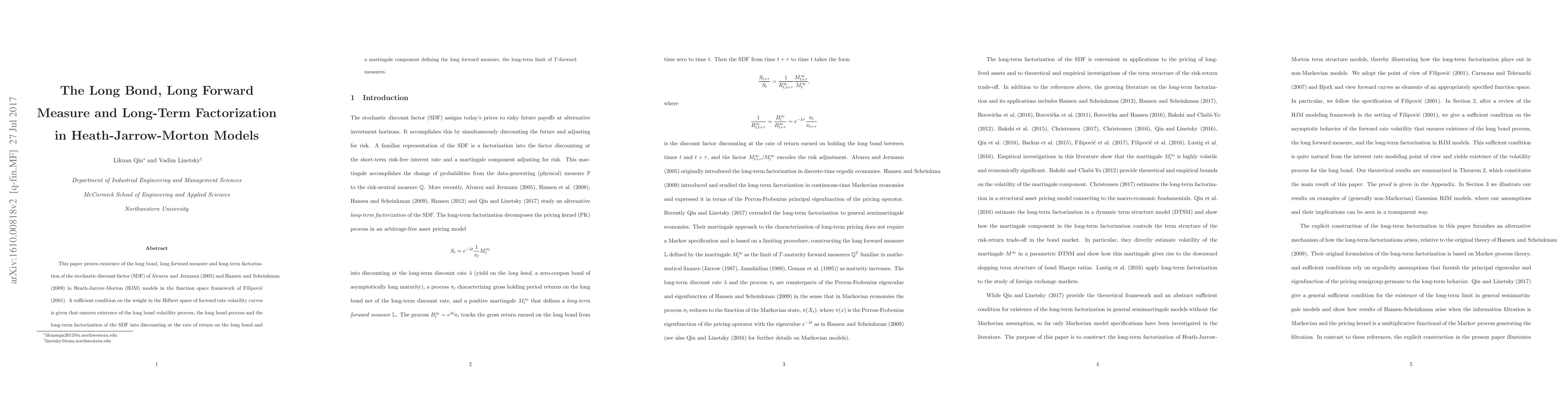 This paper proves existence of the long bond, long forward measure and long-term factorization of the stochastic discount factor (SDF) of Alvarez and Jermann (2005) and Hansen and Scheinkman (2009) in Heath-Jarrow-Morton (HJM) models in the function space framework of Filipovic (2001). A sufficient condition on the weight in the Hilbert space of forward rate volatility curves is given that ensures existence of the long bond volatility process, the long bond process and the long-term factorization of the SDF into discounting at the rate of return on the long bond and a martingale component defining the long forward measure, the long-term limit of T-forward measures.