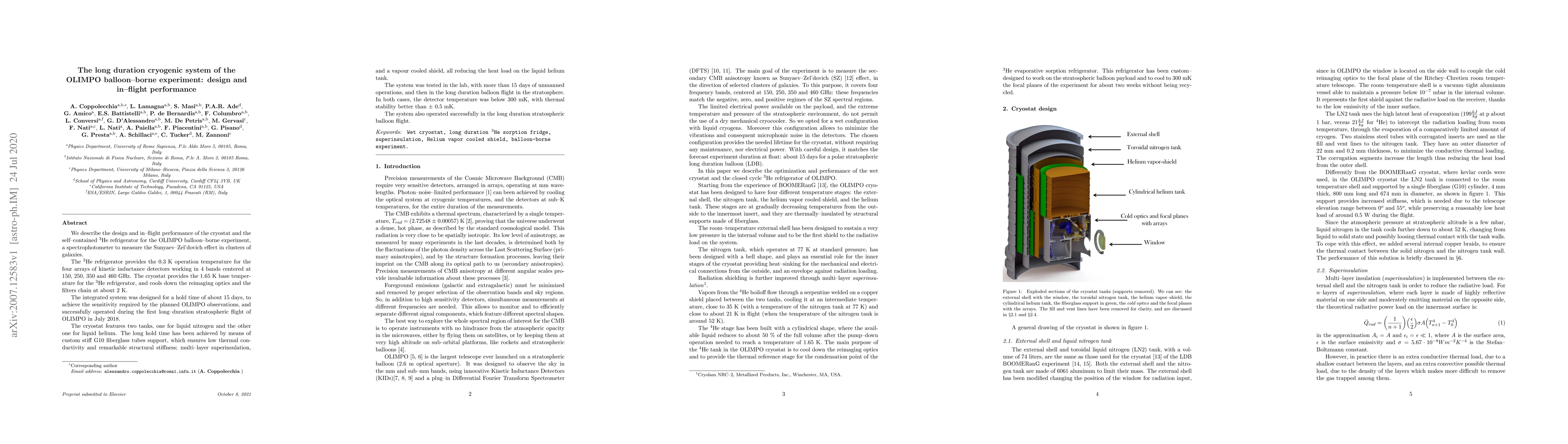 This paper details the design and in-flight performance of the cryogenic system for the OLIMPO balloon-borne spectrophotometer, which measures the Sunyaev-Zel'dovich effect. The system includes a $^{3}$He refrigerator and a cryostat, achieving temperatures of 0.3 K and 1.65 K respectively, and successfully operated for 15 days in a stratospheric flight.