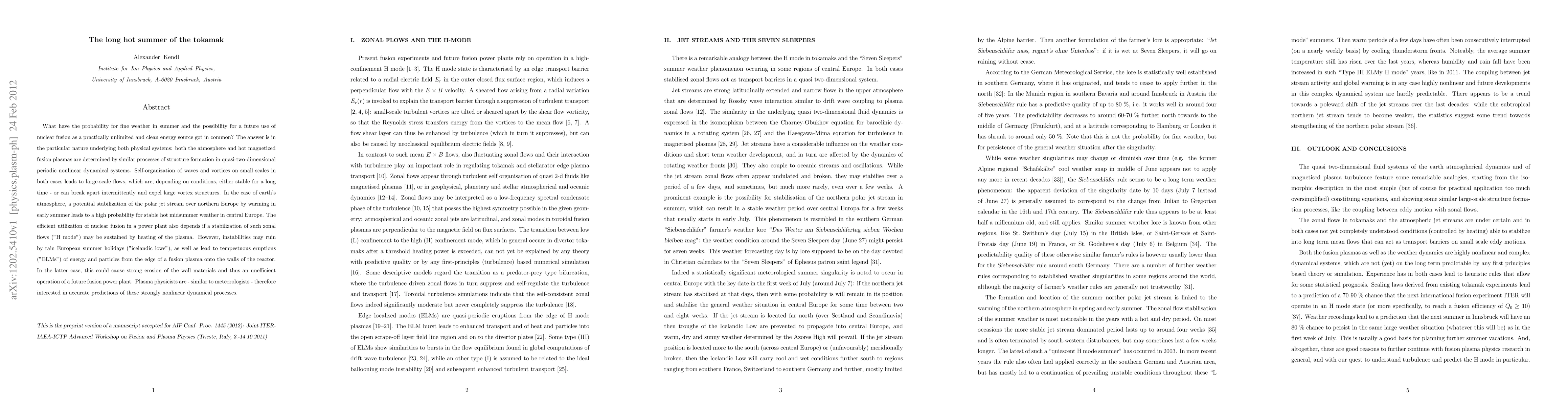What have the probability for fine weather in summer and the possibility for a future use of nuclear fusion as a practically unlimited and clean energy source got in common? The answer is in the particular nature underlying both physical systems: both the atmosphere and hot magnetized fusion plasmas are determined by similar processes of structure formation in quasi-two-dimensional periodic nonlinear dynamical systems. Self-organization of waves and vortices on small scales in both cases leads to large-scale flows, which are, depending on conditions, either stable for a long time - or can break apart intermittently and expel large vortex structures. In the case of earth's atmosphere, a potential stabilization of the polar jet stream over northern Europe by warming in early summer leads to a high probability for stable hot midsummer weather in central Europe. The efficient utilization of nuclear fusion in a power plant also depends if a stabilization of such zonal flows ("H mode") may be sustained by heating of the plasma. However, instabilities may ruin by rain European summer holidays ("icelandic lows"), as well as lead to tempestuous eruptions ("ELMs") of energy and particles from the edge of a fusion plasma onto the walls of the reactor. In the latter case, this could cause strong erosion of the wall materials and thus an unefficient operation of a future fusion power plant. Plasma physicists are - similar to meteorologists - therefore interested in accurate predictions of these strongly nonlinear dynamical processes.
