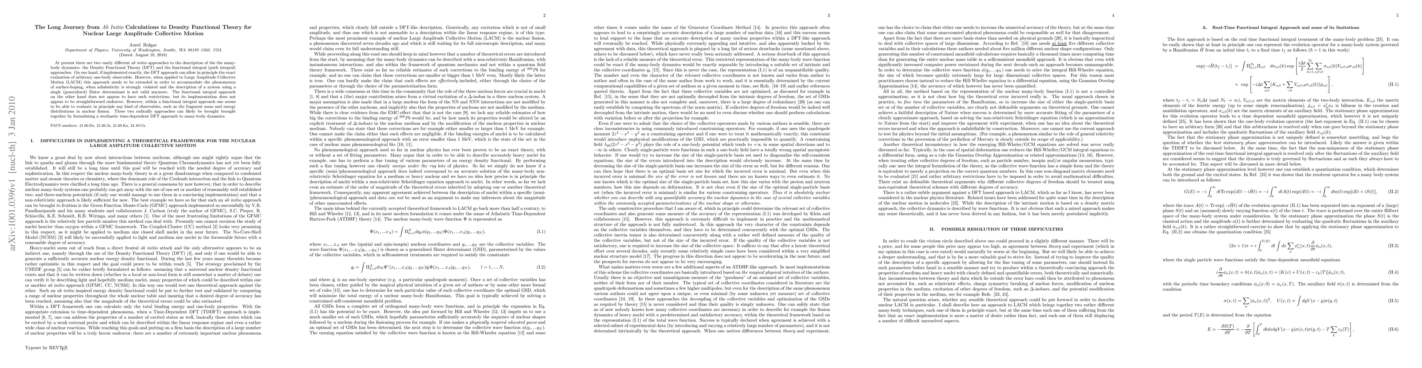 The paper explores two ab initio methods for many-body dynamics in nuclear physics: Density Functional Theory (DFT) and functional integral approaches. DFT, while capable of exact one-body observable evaluation, requires extension for Large Amplitude Collective Motion (LACM) due to surface-hoping. Functional integral methods, though without DFT's restrictions, are complex to implement. A unified stochastic time-dependent DFT approach for many-body dynamics is proposed as a potential solution.