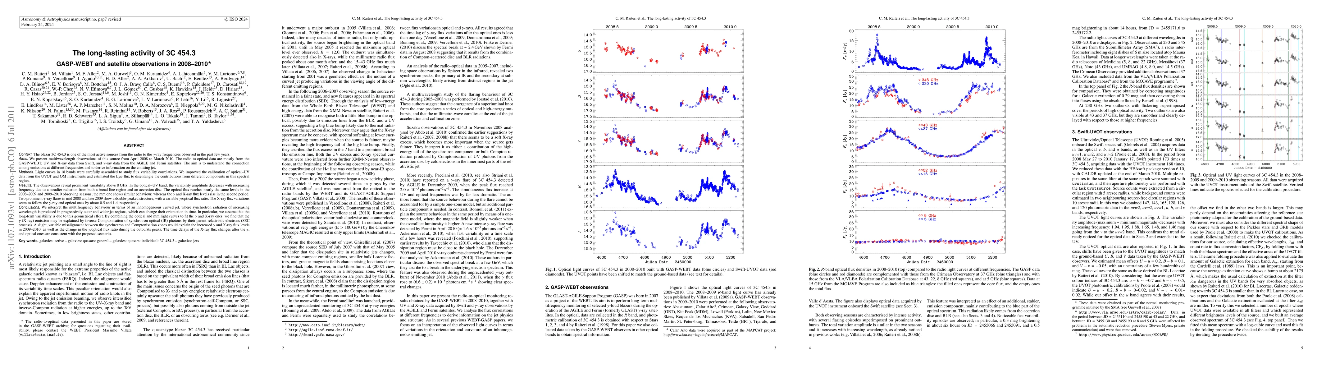 This paper presents multiwavelength observations of the blazar 3C 454.3 from 2008 to 2010, revealing prominent variability in gamma rays and X-rays, with a double-peaked flare structure. The study attributes the long-term variability to a geometrically changing jet, with gamma and X-ray emissions explained by inverse-Comptonisation of synchrotron photons.