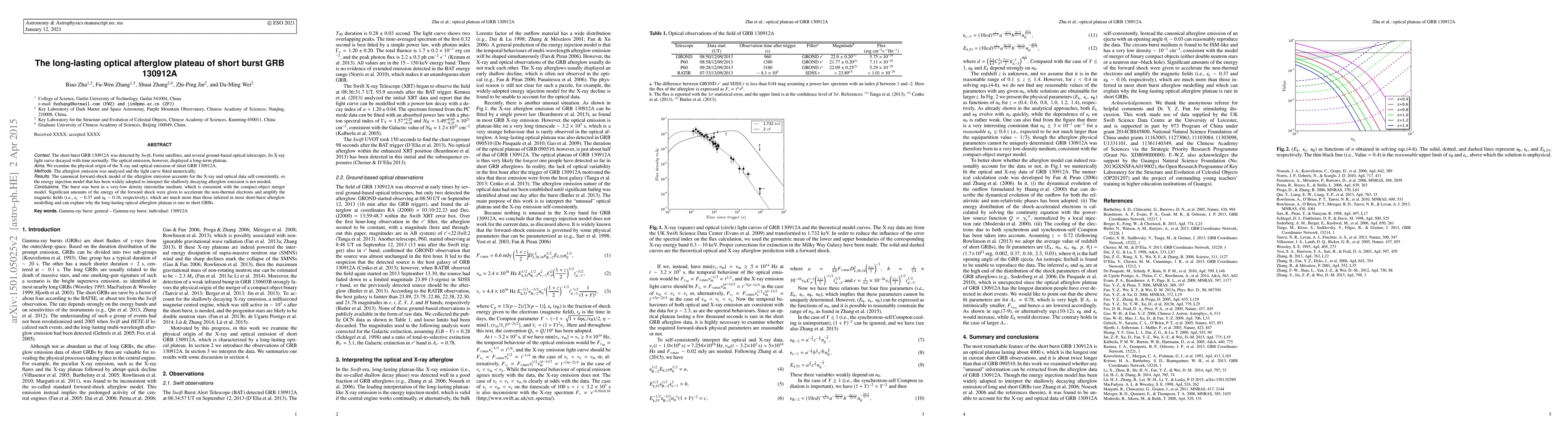 This paper investigates the long-lasting optical afterglow plateau of short burst GRB 130912A, finding that the canonical forward shock model explains both X-ray and optical emissions without requiring an energy injection model. The study suggests the burst occurred in a low-density medium, supporting the compact object merger model.
