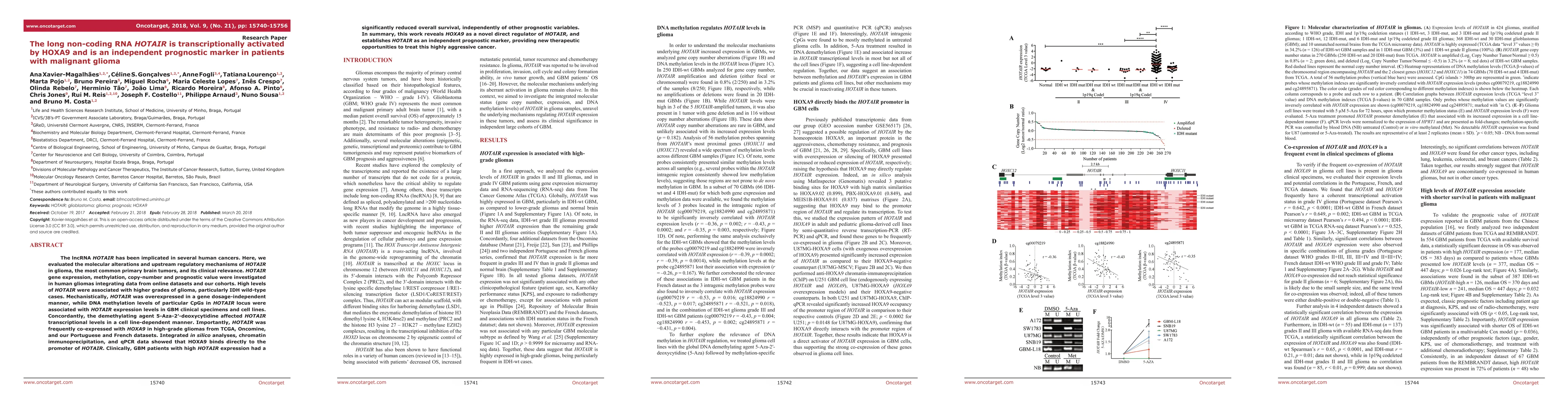 The lncRNA HOTAIR has been implicated in several human cancers. Here, we evaluated the molecular alterations and upstream regulatory mechanisms of HOTAIR in glioma, the most common primary brain tumors, and its clinical relevance. HOTAIR gene expression, methylation, copy-number and prognostic value were investigated in human gliomas integrating data from online datasets and our cohorts. High levels of HOTAIR were associated with higher grades of glioma, particularly IDH wild-type cases. Mechanistically, HOTAIR was overexpressed in a gene dosage-independent manner, while DNA methylation levels of particular CpGs in HOTAIR locus were associated with HOTAIR expression levels in GBM clinical specimens and cell lines. Concordantly, the demethylating agent 5-Aza-2'-deoxycytidine affected HOTAIR transcriptional levels in a cell line-dependent manner. Importantly, HOTAIR was frequently co-expressed with HOXA9 in high-grade gliomas from TCGA, Oncomine, and our Portuguese and French datasets. Integrated in silico analyses, chromatin immunoprecipitation, and qPCR data showed that HOXA9 binds directly to the promoter of HOTAIR. Clinically, GBM patients with high HOTAIR expression had a significantly reduced overall survival, independently of other prognostic variables. In summary, this work reveals HOXA9 as a novel direct regulator of HOTAIR, and establishes HOTAIR as an independent prognostic marker, providing new therapeutic opportunities to treat this highly aggressive cancer.