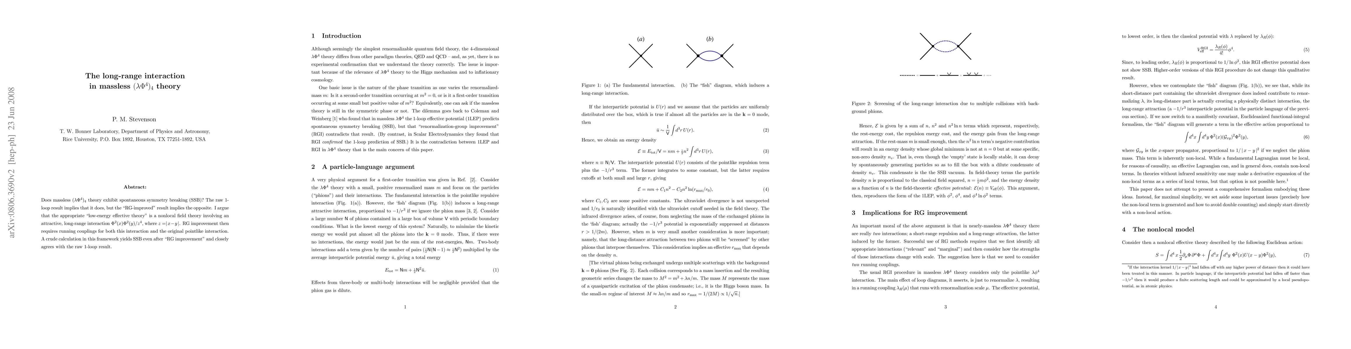 Does massless (lambda Phi^4)_4 theory exhibit spontaneous symmetry breaking (SSB)? The raw 1-loop result implies that it does, but the "RG-improved" result implies the opposite. I argue that the appropriate "low-energy effective theory" is a nonlocal field theory involving an attractive, long-range interaction Phi^2(x) Phi^2(y)/z^4, where z=|x-y|. RG improvement then requires running couplings for both this interaction and the original pointlike interaction. A crude calculation in this framework yields SSB even after "RG improvement" and closely agrees with the raw 1-loop result.