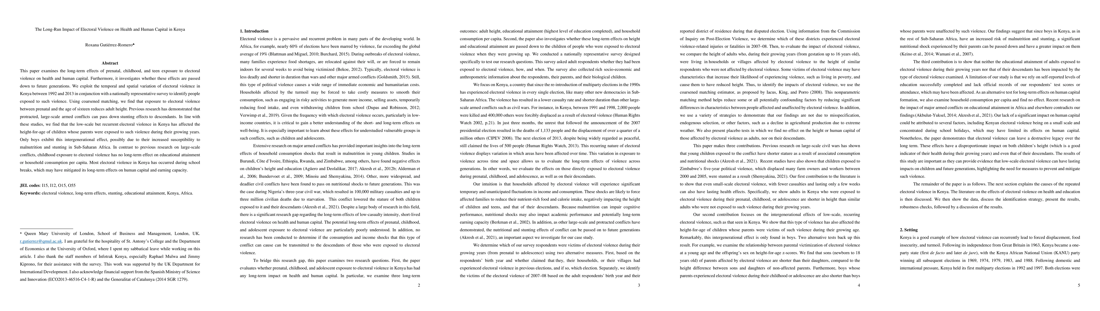 This study finds that prenatal to age sixteen exposure to electoral violence in Kenya reduces adult height and intergenerationally affects boys' height-for-age, but does not impact educational attainment or household consumption per capita. The study highlights the long-term health impacts of electoral violence and its generational transmission.
