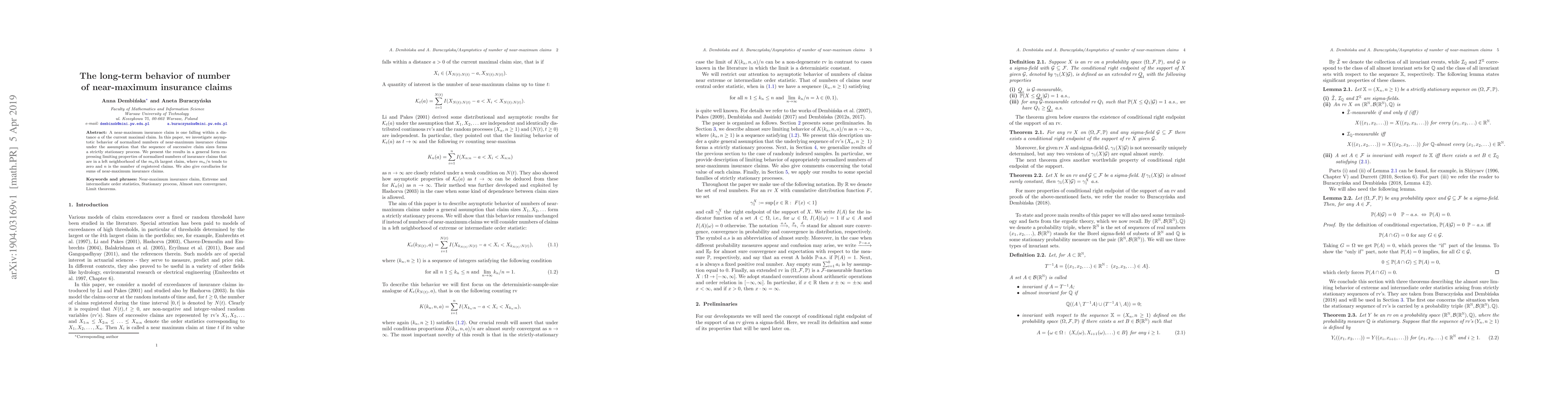 A near-maximum insurance claim is one falling within a distance $a$ of the current maximal claim. In this paper, we investigate asymptotic behavior of normalized numbers of near-maximum insurance claims under the assumption that the sequence of successive claim sizes forms a strictly stationary process. We present the results in a general form expressing limiting properties of normalized numbers of insurance claims that are in a left neighborhood of the $m_n$th largest claim, where $m_n/n$ tends to zero and $n$ is the number of registered claims. We also give corollaries for sums of near-maximum insurance claims.