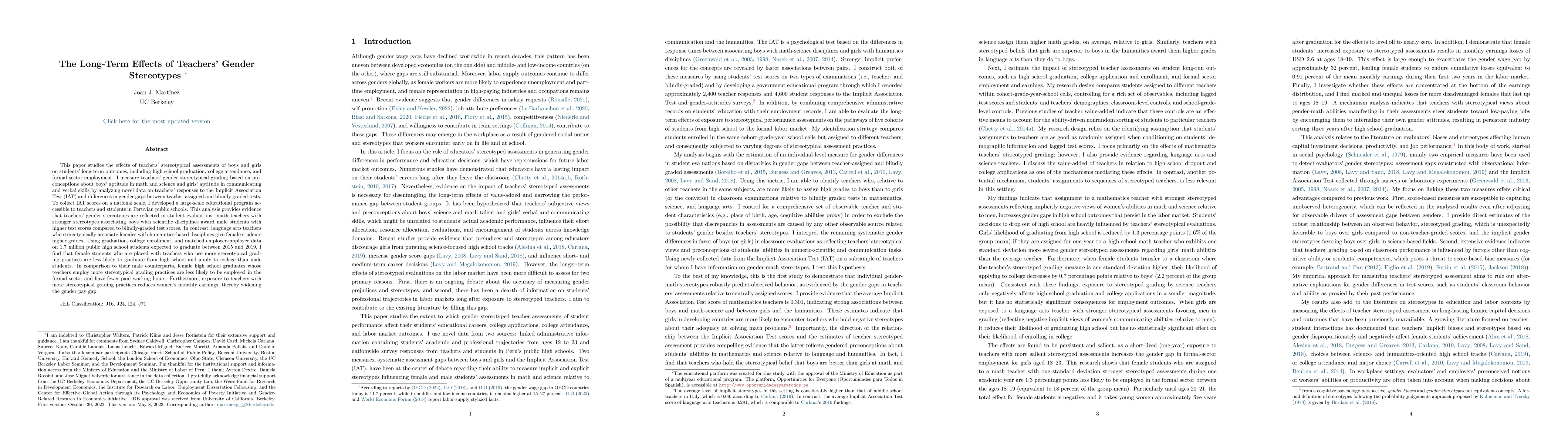 This paper investigates the long-term impacts of teachers' gender stereotypes on student outcomes, revealing that stereotypical grading practices negatively affect female students' high school graduation, college attendance, and formal sector employment. The study finds that female students with teachers who hold stronger gender stereotypes are less likely to succeed academically and professionally compared to their male peers.