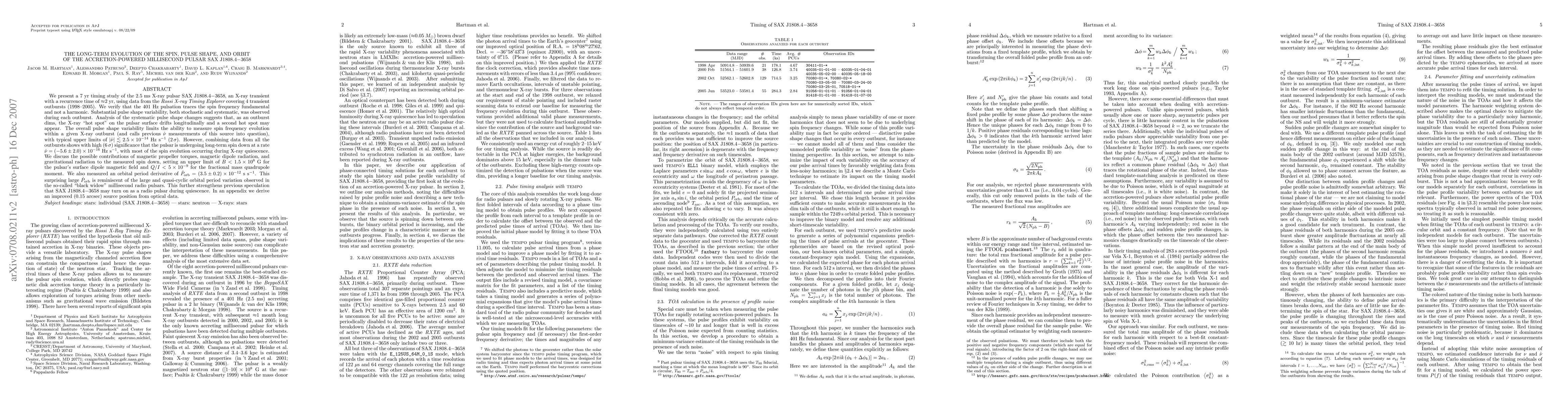 We present a 7 yr timing study of the 2.5 ms X-ray pulsar SAX J1808.4-3658, an X-ray transient with a recurrence time of ~2 yr, using data from the Rossi X-ray Timing Explorer covering 4 transient outbursts (1998-2005). We verify that the 401 Hz pulsation traces the spin frequency fundamental and not a harmonic. Substantial pulse shape variability, both stochastic and systematic, was observed during each outburst. Analysis of the systematic pulse shape changes suggests that, as an outburst dims, the X-ray "hot spot" on the pulsar surface drifts longitudinally and a second hot spot may appear. The overall pulse shape variability limits the ability to measure spin frequency evolution within a given X-ray outburst (and calls previous nudot measurements of this source into question), with typical upper limits of |nudot| < 2.5x10^{-14} Hz/s (2 sigma). However, combining data from all the outbursts shows with high (6 sigma) significance that the pulsar is undergoing long-term spin down at a rate nudot = (-5.6+/-2.0)x10^{-16} Hz/s, with most of the spin evolution occurring during X-ray quiescence. We discuss the possible contributions of magnetic propeller torques, magnetic dipole radiation, and gravitational radiation to the measured spin down, setting an upper limit of B < 1.5x10^8 G for the pulsar's surface dipole magnetic field and and Q/I < 5x10^{-9} for the fractional mass quadrupole moment. We also measured an orbital period derivative of Pdot = (3.5+/-0.2)x10^{-12} s/s. This surprising large Pdot is reminiscent of the large and quasi-cyclic orbital period variation observed in the so-called "black widow" millisecond radio pulsars, supporting speculation that SAX J1808.4-3658 may turn on as a radio pulsar during quiescence. In an appendix we derive an improved (0.15 arcsec) source position from optical data.
