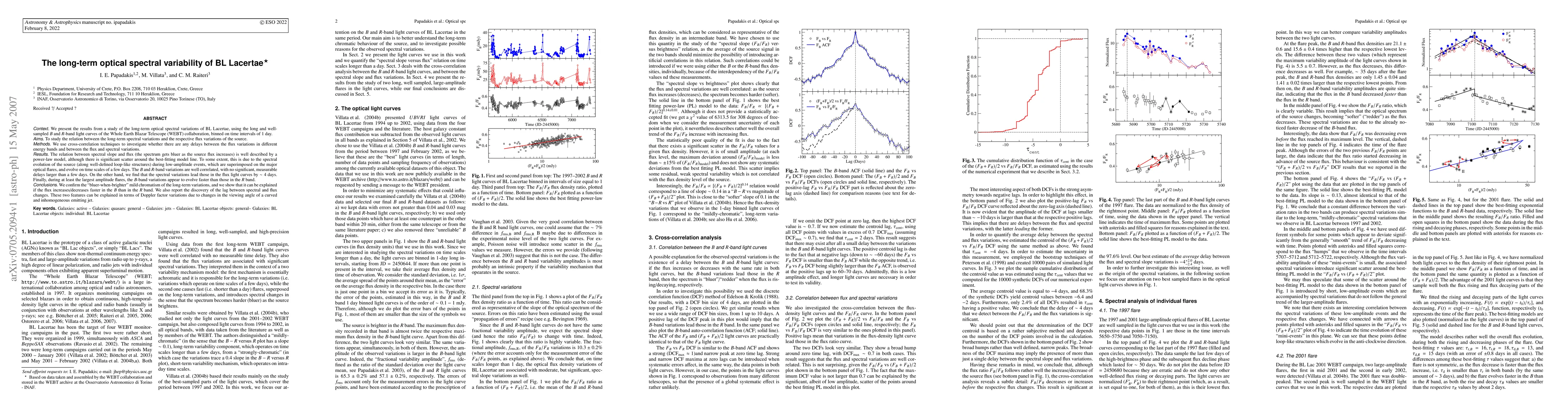 We present the results from a study of the long-term optical spectral variations of BL Lacertae, using the long and well-sampled B and R-band light curves of the Whole Earth Blazar Telescope (WEBT) collaboration, binned on time intervals of 1 day. The relation between spectral slope and flux (the spectrum gets bluer as the source flux increases) is well described by a power-law model, although there is significant scatter around the best-fitting model line. To some extent, this is due to the spectral evolution of the source (along well-defined loop-like structures) during low-amplitude events, which are superimposed on the major optical flares, and evolve on time scales of a few days. The "bluer-when-brighter" mild chromatism of the long-term variations of the source can be explained if the flux increases/decreases faster in the B than in the R band. The B and R-band variations are well correlated, with no significant, measurable delays larger than a few days. On the other hand, we find that the spectral variations lead those in the flux light curves by ~ 4 days. Our results can be explained in terms of Doppler factor variations due to changes in the viewing angle of a curved and inhomogeneous emitting jet.