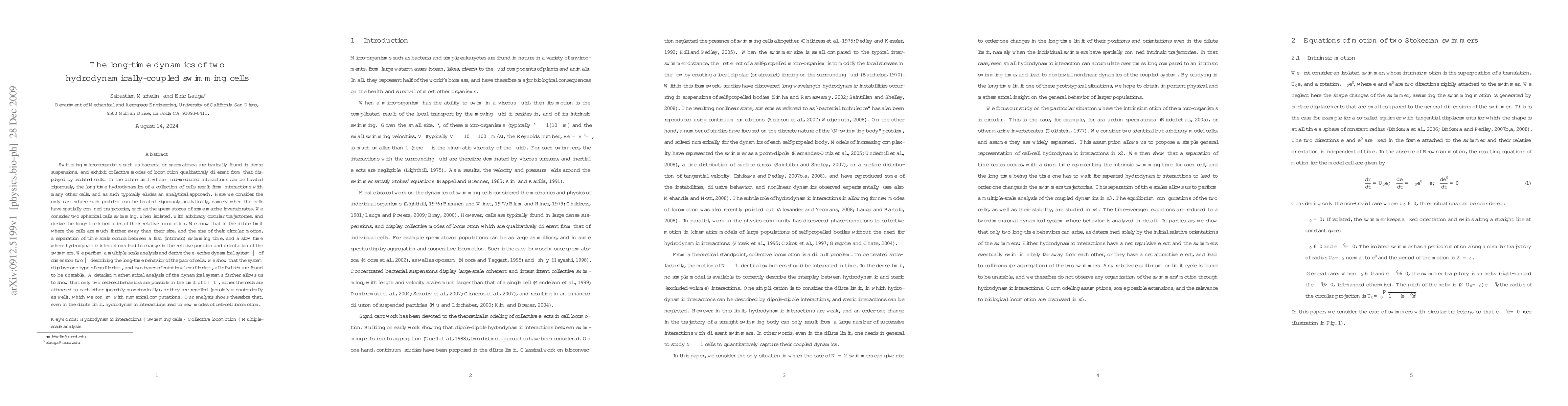 Swimming micro-organisms such as bacteria or spermatozoa are typically found in dense suspensions, and exhibit collective modes of locomotion qualitatively different from that displayed by isolated cells. In the dilute limit where fluid-mediated interactions can be treated rigorously, the long-time hydrodynamics of a collection of cells result from interactions with many other cells, and as such typically eludes an analytical approach. Here we consider the only case where such problem can be treated rigorously analytically, namely when the cells have spatially confined trajectories, such as the spermatozoa of some marine invertebrates. We consider two spherical cells swimming, when isolated, with arbitrary circular trajectories, and derive the long-time kinematics of their relative locomotion. We show that in the dilute limit where the cells are much further away than their size, and the size of their circular motion, a separation of time scale occurs between a fast (intrinsic) swimming time, and a slow time where hydrodynamic interactions lead to change in the relative position and orientation of the swimmers. We perform a multiple-scale analysis and derive the effective dynamical system - of dimension two - describing the long-time behavior of the pair of cells. We show that the system displays one type of equilibrium, and two types of rotational equilibrium, all of which are found to be unstable. A detailed mathematical analysis of the dynamical systems further allows us to show that only two cell-cell behaviors are possible in the limit of $t\to\infty$, either the cells are attracted to each other (possibly monotonically), or they are repelled (possibly monotonically as well), which we confirm with numerical computations.