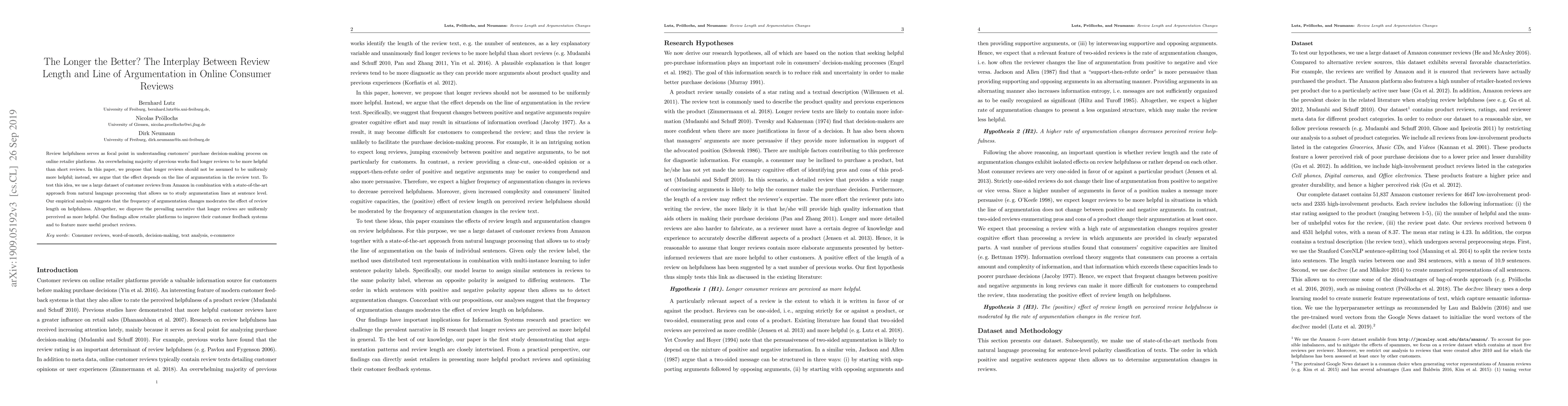 This paper examines the relationship between review length and helpfulness in online consumer reviews, challenging the assumption that longer reviews are always more helpful. Using a dataset from Amazon and NLP techniques, it finds that the frequency of argumentation in reviews moderates the impact of review length on perceived helpfulness, suggesting that review systems should focus on quality of argumentation rather than just length.